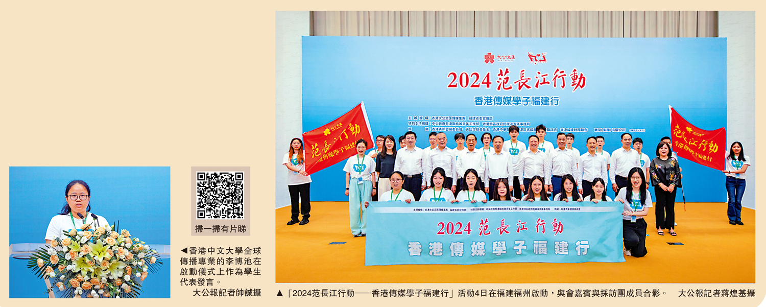 由香港大公文匯傳媒集團、福建省委宣傳部共同主辦的「2024范長江行動── 香港傳媒學子福建行」活動,7月4日在福建福州啟動。來自香港的22名學子將以實習記者身份,沿着習近平總書記當年在閩工作、生活、奮鬥的足跡,實地領略當地科技創新實力、經濟發展成效、社會治理創新和歷史文化底蘊,傳播真實、立體、全面的福建形象,領略「新福建藍圖」變現實。福建省委常委、省委宣傳部部長張彥和香港大公文匯傳媒集團董事長、大公報社長、香港文匯報社長李大宏為採訪團授旗。\大公報記者 蘇榕蓉、蔣煌基、盧靜怡、帥誠