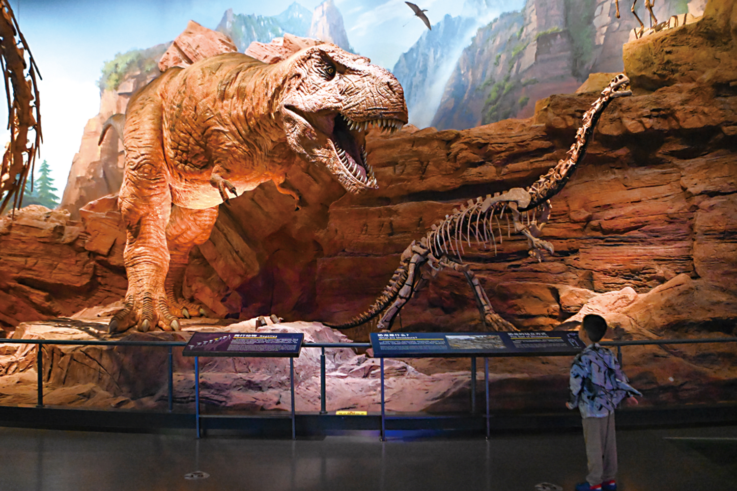 圖:進入暑期,不少遊客來到雲南玉溪澄江化石地世界自然遺產博物館參觀遊覽,了解生物的起源進化史。圖為小朋友與恐龍模型互動。\中新社