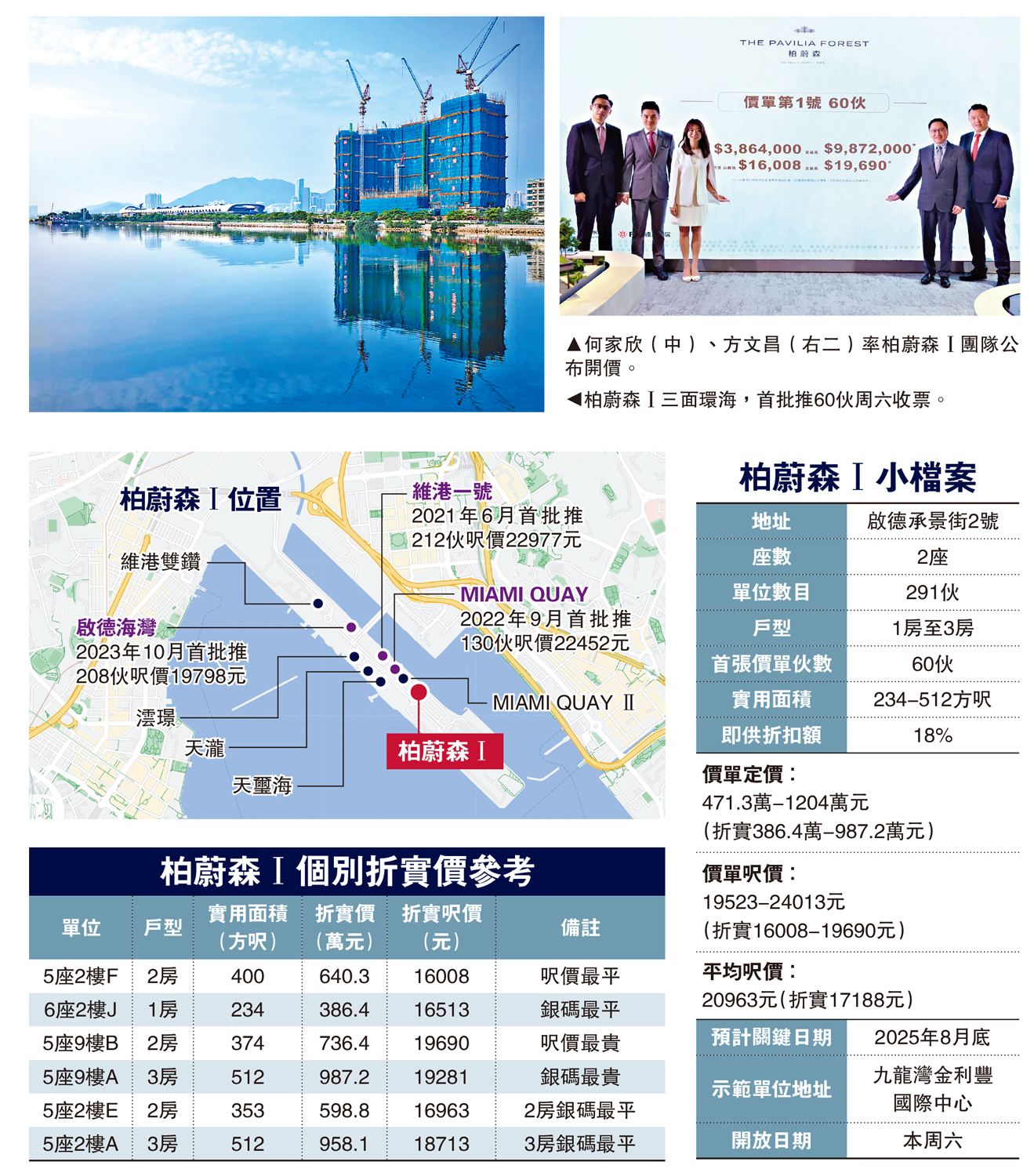計及柏蔚森Ⅰ,跑道區先後有7個新盤亮相,當中有4個以價單形式發售,參考對上兩個新盤開價,包括啟德海灣Ⅰ去年10月首推208伙,折實均價19798元,而MIAMI QUAY則於22年9月推出首批130伙,折實均價22452元,柏蔚森Ⅰ今次低開最多23%。