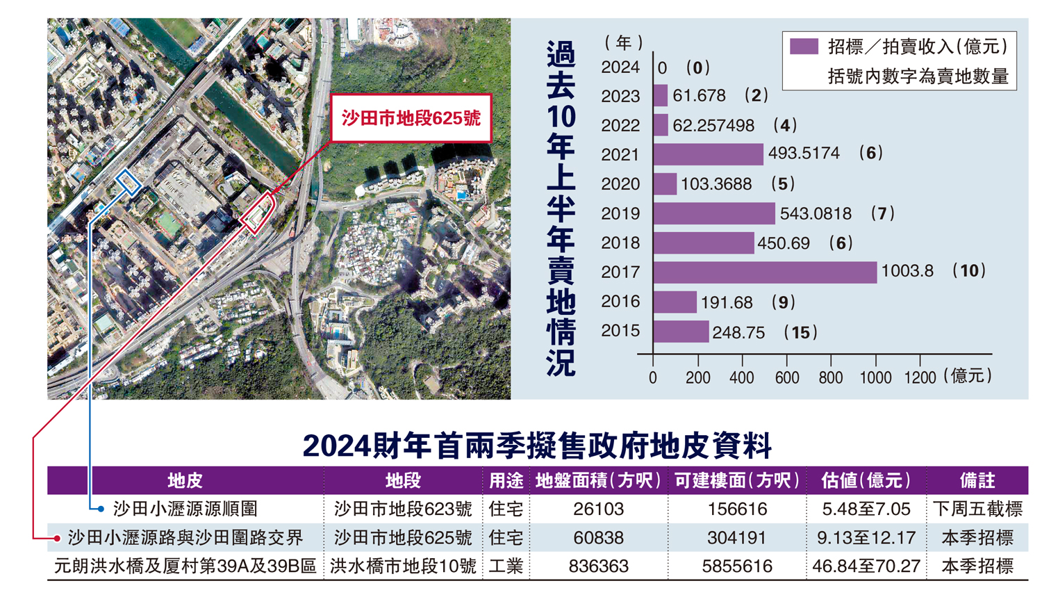 發展局局長甯漢豪昨日公布政府本地的賣地計劃,與上季一樣,僅推出1幅住宅地皮,位於沙田小瀝源。市建局於今季也會推出九龍城啟德道/沙浦道商住重建項目招標,料提供約810個單位;另預計有3幅來自私人市場的土地,於季內可完成換地改契手續,共提供約410個單位。因此,本季的總土地供應的可建屋量料約1790個。