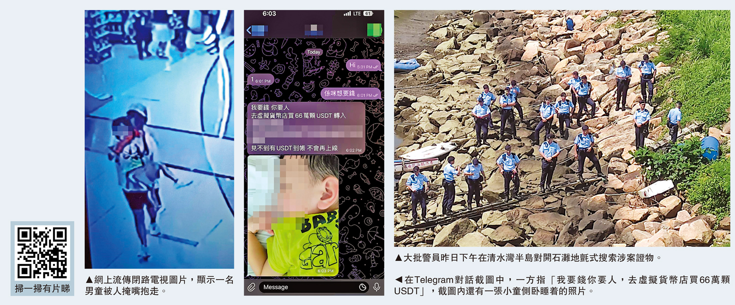 事發前日下午4時許,一名3歲男童隨同母親,與母親友人及其子女在逛商場,兩名女子在男童母親不為意的情況下突然將男童擄走,兩人帶備嬰兒車、行李箱及替換衣物等明顯是預謀犯案。母親發現兒子失蹤,其後接獲勒索的訊息。前晚網上陸續傳出數張照片,包括一張閉路電視圖片,顯示一名男童被一名身穿淺色衫、戴鴨舌帽的人用手巾掩嘴抱走,另外的圖片包括一張剪貼而成、上有簡體字「想小朋友安全不可報警」,及「下載Telegram」以聯絡一個賬號,以及一張圖片相信是聯絡該賬號後的Telegram對話截圖,對方指「我要錢你要人,去虛擬貨幣店買66萬顆USDT(即泰達幣,折合約514萬港元)」,要求將虛擬貨幣轉入一個位址,威脅對方「見不到有USDT到場,不會再上線」,該截圖內有一張小童的近照,可見男童正側卧睡着。