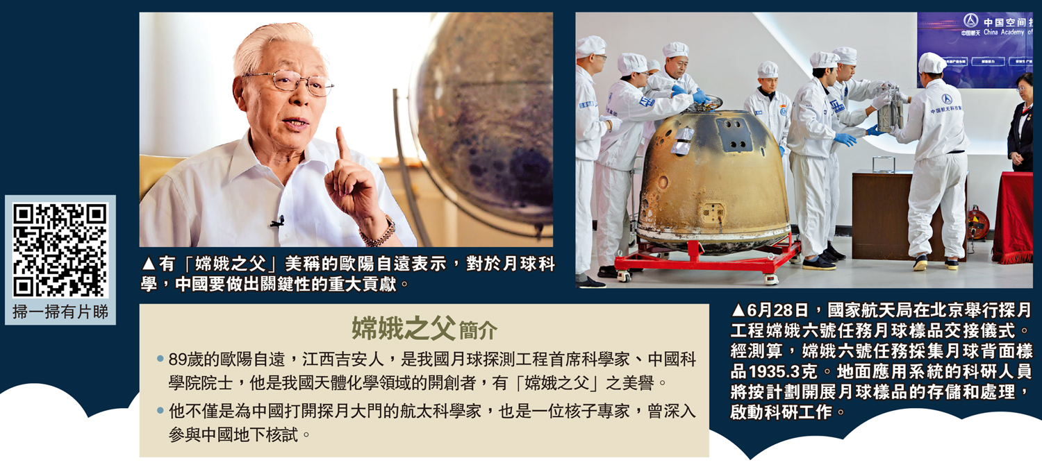歐陽自遠表示,嫦娥六號要解決最「老」的問題,是要把月球歷史研究得更完備,一定要對人類把月球講清楚。對於月球科學,中國要做出關鍵性的重大貢獻。\大公報記者劉凝哲北京報道、湯嘉平香港報道