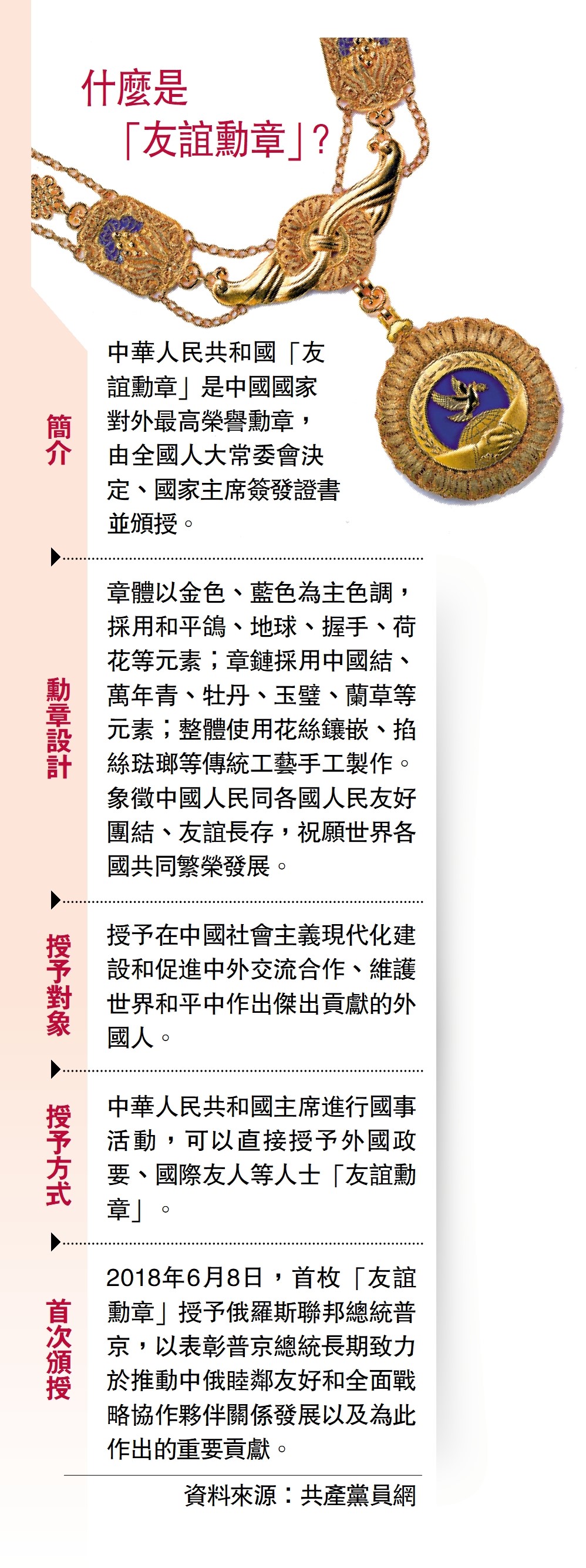 中華人民共和國主席進行國事活動,可以直接授予外國政要、國際友人等人士「友誼勳章」。