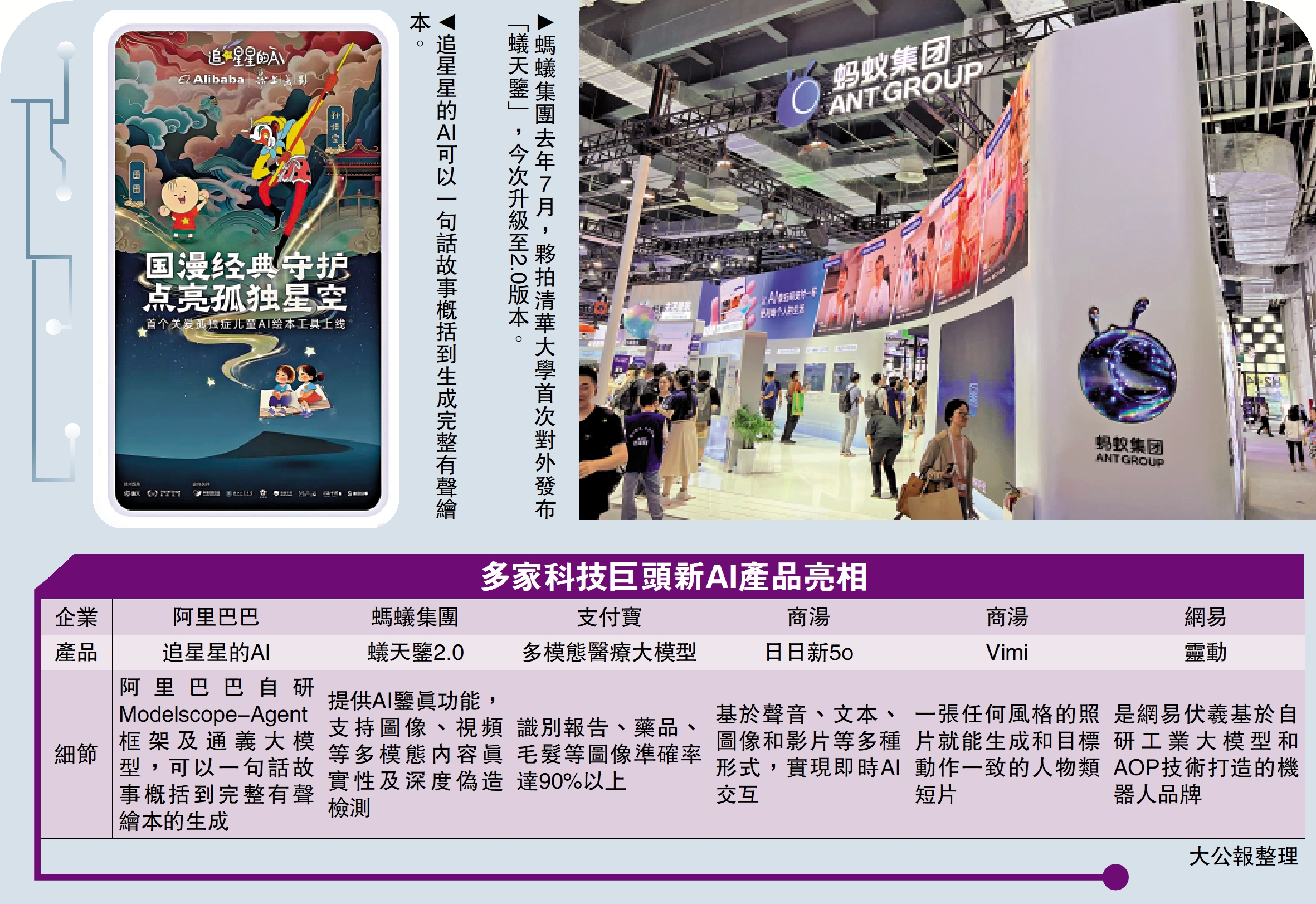 在上海舉行的世界人工智能大會(WAIC)上,多家內地科網龍頭發布新產品搶佔市場機遇。其中,阿里系連番有新品亮相,阿里巴巴(09988)公布,推出內地首個針對孤獨症(港稱自閉症)兒童的AI繪本工具「追星星的AI」,支付寶發布多模態醫療大模型,對診療報告、醫學藥品、毛髮狀況等進行識別,螞蟻集團大模型「蟻天鑒2.0」登場,新增AI鑒真功能。/大公報記者 李潔儀