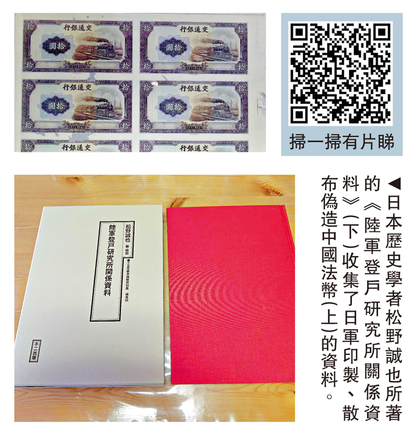 通過整理這些資料,松野誠也在2017年和2018年分別撰寫了相關學術論文,並於今年7月7日出版新書《陸軍登戶研究所相關資料》。松野誠也特別提到,新發現的資料詳細記錄了日本陸軍和政府為了削弱中國的抗戰能力,策劃並實施了通過偽造國民政府法定貨幣(法幣)來引發通貨膨脹,從而破壞中國經濟的陰謀。