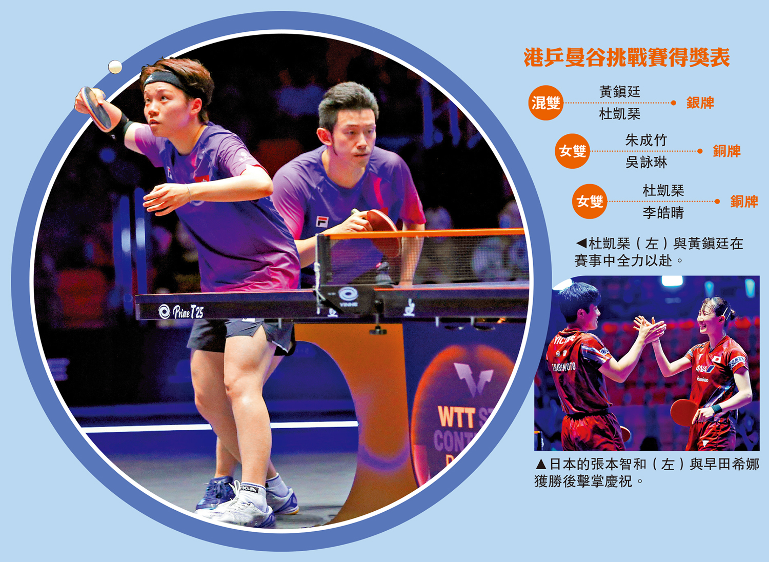 昨天在泰國上演的WTT曼谷明星挑戰賽混雙決賽,中國香港乒乓球隊頭號混雙組合「黃杜配」黃鎮廷/杜凱琹硬撼世界排名第3位的日本組合張本智和/早田希娜。「黃杜配」雖然在落後兩局3:11和8:11的劣勢下一度以11:9扳回一局,但在第4局關鍵分的把握上不足,最終再輸8:11、以總局數1:3不敵張本智和/早田希娜,但這枚銀牌仍足夠兩人征戰巴黎奧運會測試實力及增強信心。\大公報記者 張銳