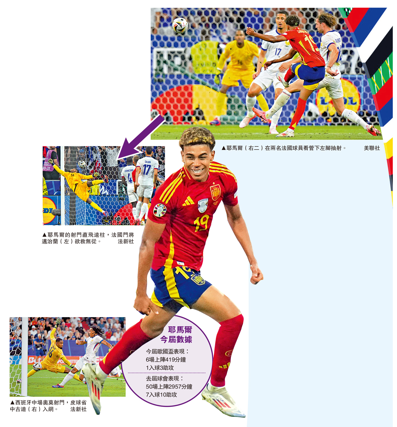 天才中學超新星橫空出世!歐國盃4強賽西班牙對法國昨晨交鋒,法國於9分鐘由高路梅安尼先開紀錄,但西班牙翼鋒耶馬爾以16歲362日之齡,破球王比利塵封66年紀錄,射入世界波追平1:1,及後再由丹尼爾奧莫入球,西班牙終反勝2:1,晉級決賽。西班牙繼2012年後再度殺入決賽衝冠,這位將於決賽前一日迎接17歲的小將表示,希望在德國贏盡所有比賽,然後以冠軍獎盃與隊友一同慶生。\大公報記者 梁潤森