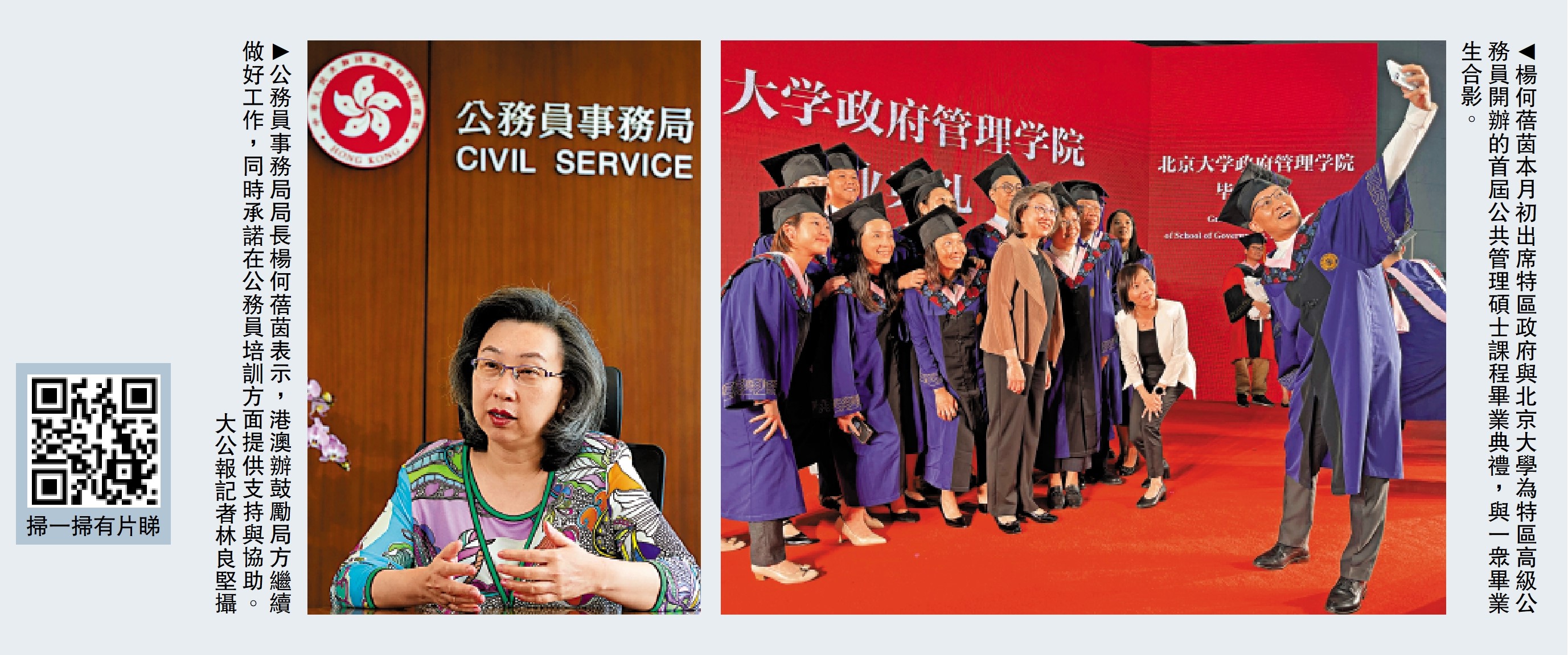 公務員事務局局長楊何蓓茵於7月1日率團前往北京,訪京期間,拜訪了國務院港澳事務辦公室,出席特區政府與北京大學為特區高級公務員開辦的首屆公共管理碩士課程畢業典禮,與畢業生和正在北大學習的特區公務員會面交流。楊何蓓茵回港後接受《大公報》專訪時表示,港澳辦鼓勵局方繼續做好工作,同時承諾在公務員培訓方面,如果有所需求,將會提供必要的支持與協助。