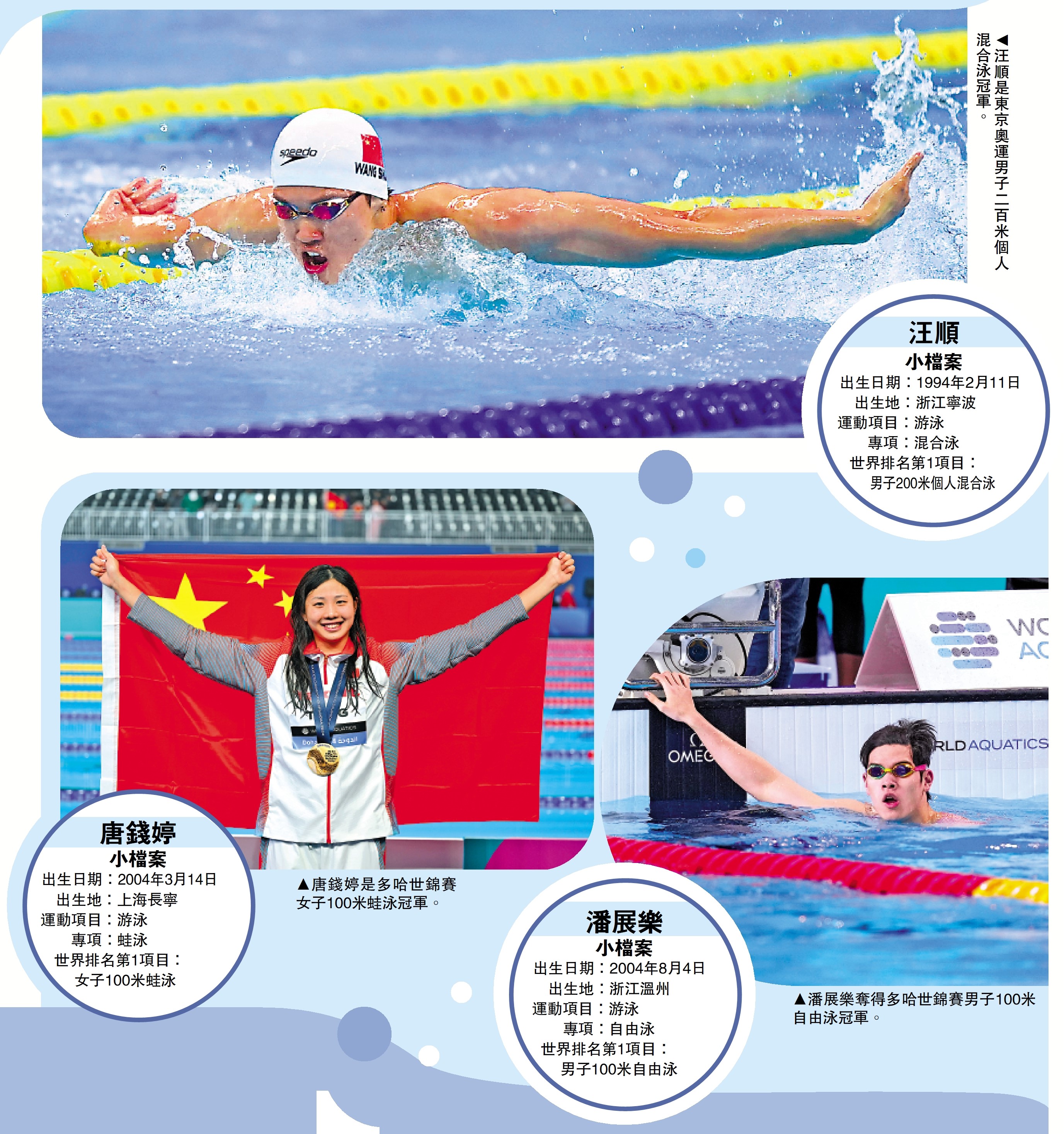 東京奧運上,中國游泳隊獲得3金2銀1銅共6枚獎牌,位居游泳項目獎牌榜第4。除汪順和張雨霏在個人項目中獲得金牌,國家隊還在女子4×200米自由泳接力項目中奪冠並打破世界紀錄,表現超過預期。巴黎奧運,中國游泳隊派出31人的陣容出戰,包括張雨霏、汪順、葉詩文、李冰潔、楊浚瑄、湯慕涵6位奧運冠軍,以及男子100米自由泳世界紀錄保持者潘展樂、世錦賽蛙泳「3冠王」覃海洋、前背泳世界冠軍徐嘉余等名將。