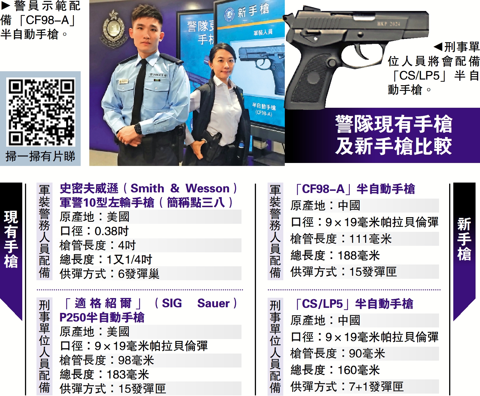 警方昨日(11日)宣布,為配合警隊長遠行動需要,警方已購置兩款中國製9毫米半自動手槍,包括「CF98-A」半自動手槍及「CS/LP5」半自動手槍,分別取代軍裝人員使用的美國製史密夫威遜(Smith & Wesson)軍警10型左輪手槍,以及刑事單位人員配備的「適格紹爾」(SIG Sauer)P250半自動手槍,警方將安排衝鋒隊、機動部隊、快速應變部隊及總部刑事部人員率先訓練使用新手槍,並在7月25日起配備新半自動手槍執勤,其他人員將繼續使用現有手槍,並分階段安排接受訓練,預計每年約2000名警員轉用新槍。