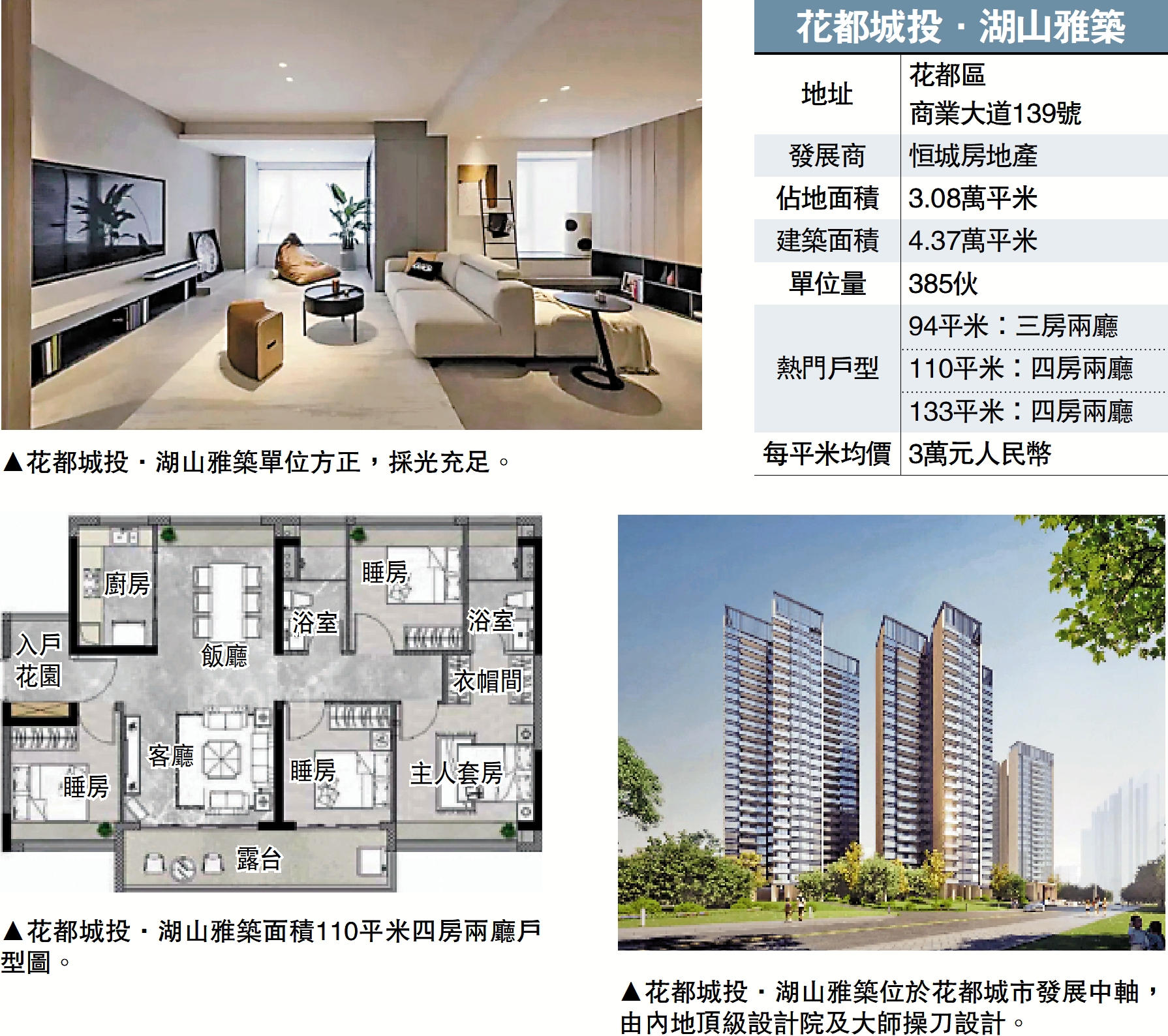 該項目商品住宅共4幢、人才房3幢,兩個小區未來將分開管理。銷售人士介紹,花都城投·湖山雅築共提供385伙,主推單位面積94至133平米,間隔由三房至四房,「參考區府板塊樓盤,項目首批開盤每平米均價約3萬元人民幣(約3.2萬港元)。」