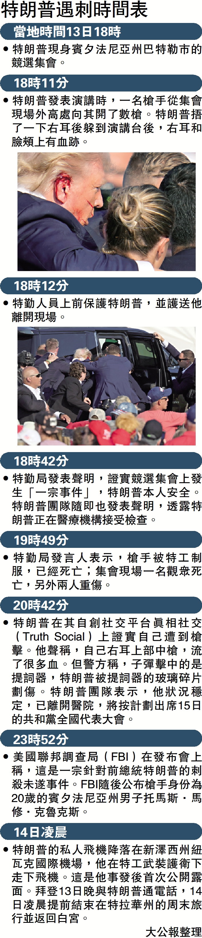•特勤局發表聲明,證實競選集會上發生「一宗事件」,特朗普本人安全。特朗普團隊隨即也發表聲明,透露特朗普正在醫療機構接受檢查。