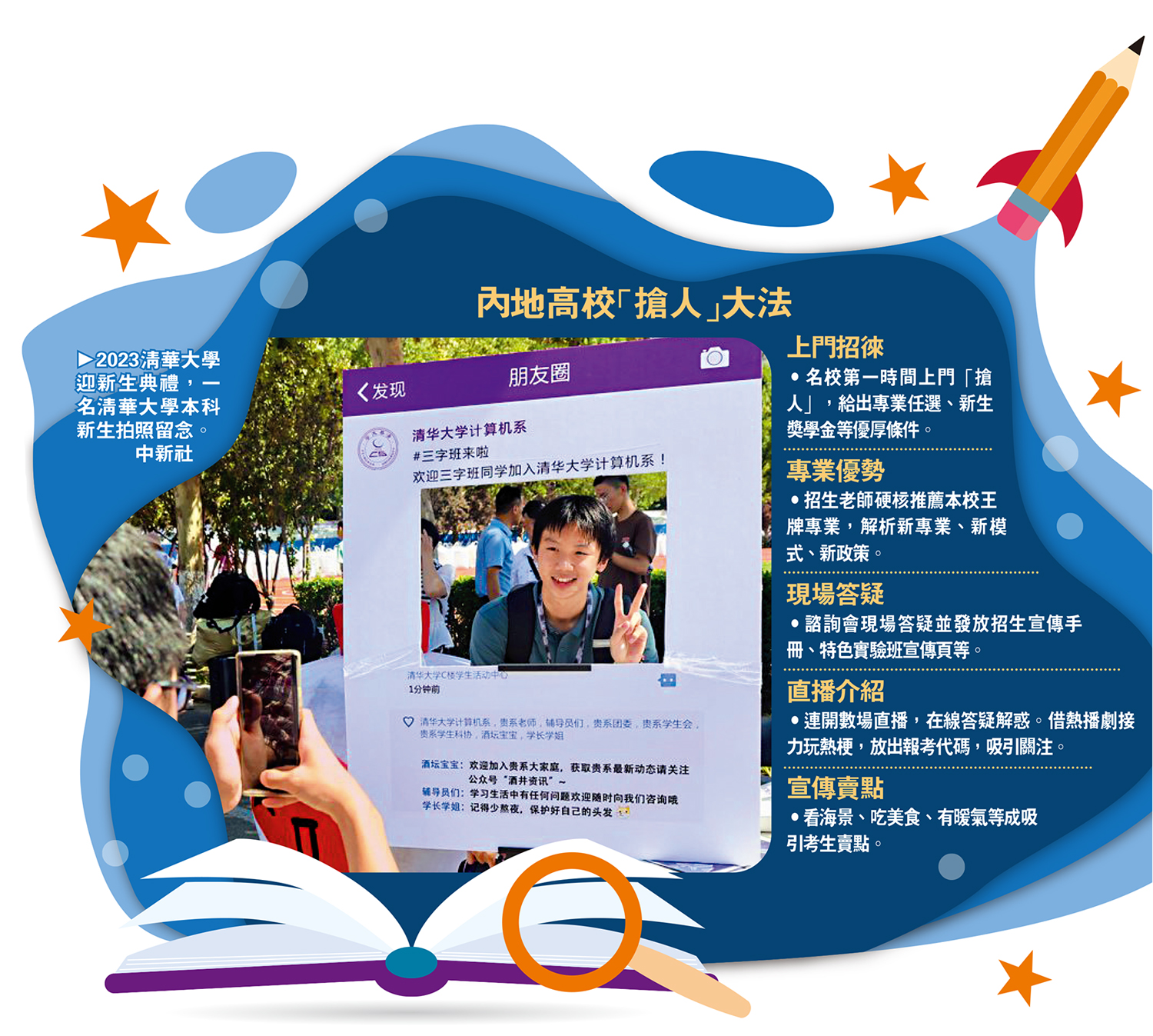 隨着2024年內地高考成績的陸續公布,志願填報正式開啟,各大高校進入「搶人」大戰模式。其中,以北京大學、清華大學為代表的諸多知名高校主動出擊,在全國各地提前布局招生組,第一時間通過電話、面談等方式,向優秀考生拋去橄欖枝,承諾提供考生心儀的專業,詳解優勢、獎學金政策等,邀請考生簽約。大公報記者在採訪中發現,在諮詢和決策過程中,家長普遍比較關心心儀專業的未來發展,而考生則更注重興趣。亦有不少考生早早明確了目標專業,接到名校邀約後,第一時間奔赴現場簽約。\大公報記者 江鑫嫻