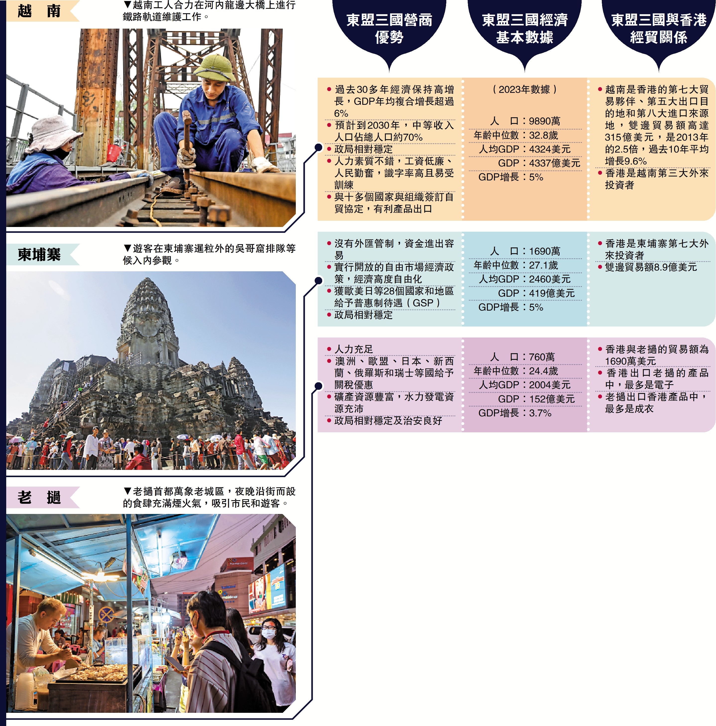 為協助港商拓東盟市場,行政長官李家超於本月率團出訪老撾、柬埔寨及越南等東盟三國。香港貿發局研究總監范婉兒表示,老撾經濟正緩慢恢復,加上中老鐵路開通促進其鐵路運輸轉運角色,而且柬埔寨經濟增長較快,預料大力推動電子機械、藥物醫療、高科技、能源、綠色等相關行業發展,至於越南則在可再生能源設備方面有需求,需要大量資金,而香港在很多方面都能滿足三國需要,存在很大商機。\大公報記者 李 信