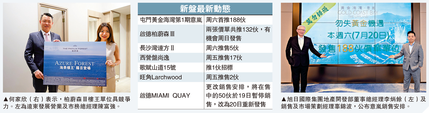 新盤熱銷,發展商繼續加速去貨。新世界(00017)夥遠東發展(00035)的啟德跑道區柏蔚森Ⅲ,原價加推60伙,折實平均呎價18354元,包括首度發售海景一房戶,項目至今推出132伙,有機會周日開賣。至於旭日國際屯門青山公路黃金海灣第1期意嵐,落實周六首推188伙,意味本周或有320伙應市,料是4個月來最旺場周末。\大公報記者 梁穎賢