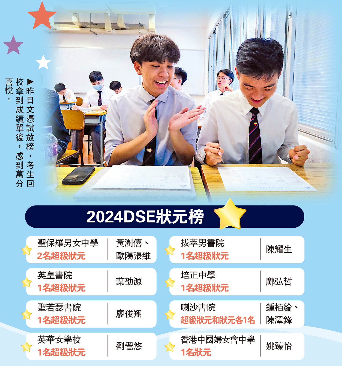 今屆中學文憑試成績昨日放榜。今年有約4.9萬人參加文憑試,學生在中英數必修部分達標的比率全部上升,逾1.8萬人達入讀大學門檻。今屆誕生10位「狀元」,包括8男2女,當中8位狀元計劃讀醫科。談及首屆公民與社會發展科考試情況,有學生指該科目有助其提高對國家的認識,而且備考壓力不大,可釋放空間學習更多科目。