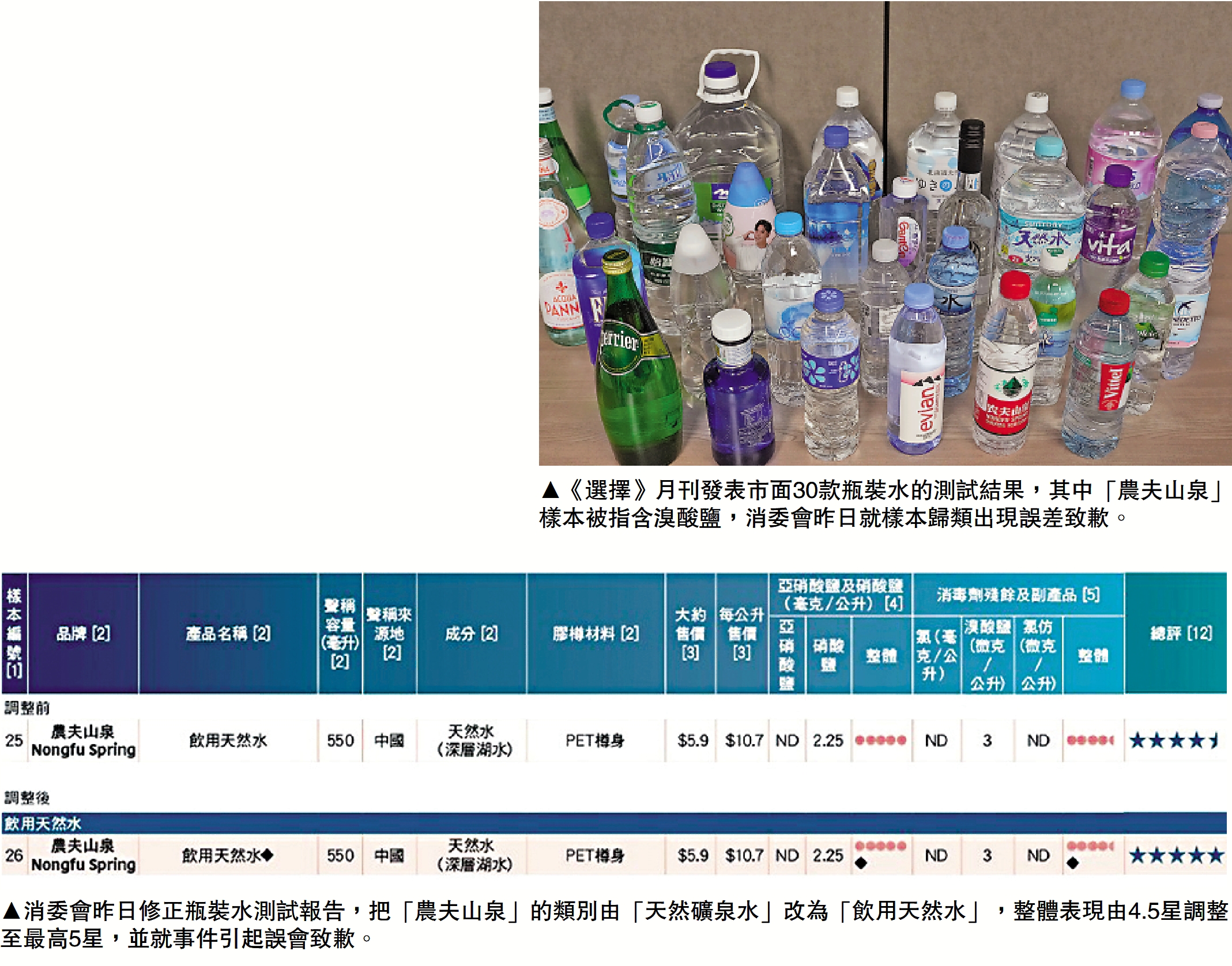 內地樽裝水品牌「農夫山泉」日前向香港消費者委員會發律師信,質疑消委會最新一期《選擇》月刊,把「農夫山泉」瓶裝水歸類為「天然礦泉水」,並且對產品作出不客觀的評價,對公司聲譽造成巨大傷害,要求澄清道歉。事隔三日後,消委會昨日修正瓶裝水測試報告,把農夫山泉歸類為「飲用天然水」,並就事件引起誤會表示抱歉。