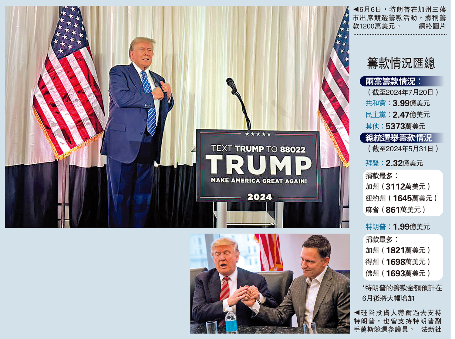 長期以來,金錢是美國選舉中的主導因素,目前共和黨陣營收到的政治捐款,已大幅拋離民主黨。民主黨大本營美國加州硅谷,越來越多科技界人士因為不滿民主黨的政策,近期也出現向共和黨靠攏的跡象。自從7月13日特朗普遭遇未遂暗殺事件以來,包括特斯拉創辦人馬斯克在內的科技界大佬,公開宣布支持特朗普。