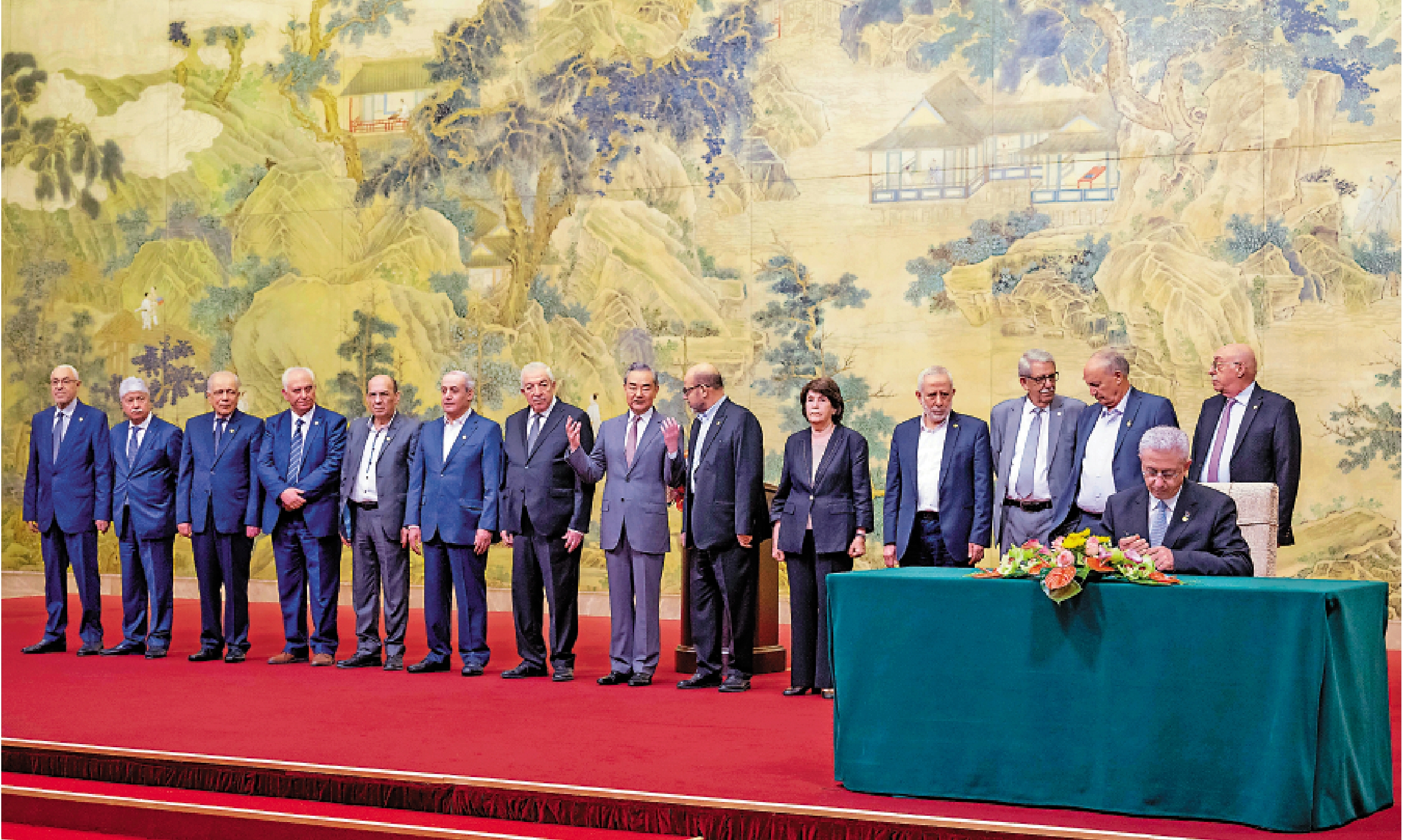 王毅表示,巴勒斯坦實現內部和解將為巴勒斯坦人民帶來希望與未來,也是推動解決巴勒斯坦問題、實現中東和平穩定的重要一步,必須持之以恆、毫不動搖地走下去。中方真誠期待巴勒斯坦各派在內部和解基礎上早日實現巴勒斯坦獨立建國,願同有關各方加強溝通協調,共同為落實好今天達成的《北京宣言》作出努力。