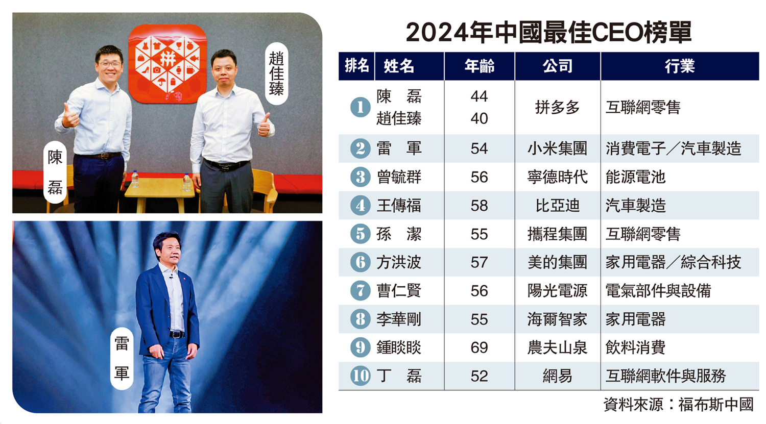 今年一共有11位CEO重回榜單,15位連續入選,並有24位CEO首次入選。福布斯中國指,單從股東回報和增長數據看,排名CEO榜單首位的陳磊和趙佳臻領導的拼多多實現了超越同儕的經營表現,這一出色業績主要歸功於本土市場經營的持續優化與海外市場的突圍。