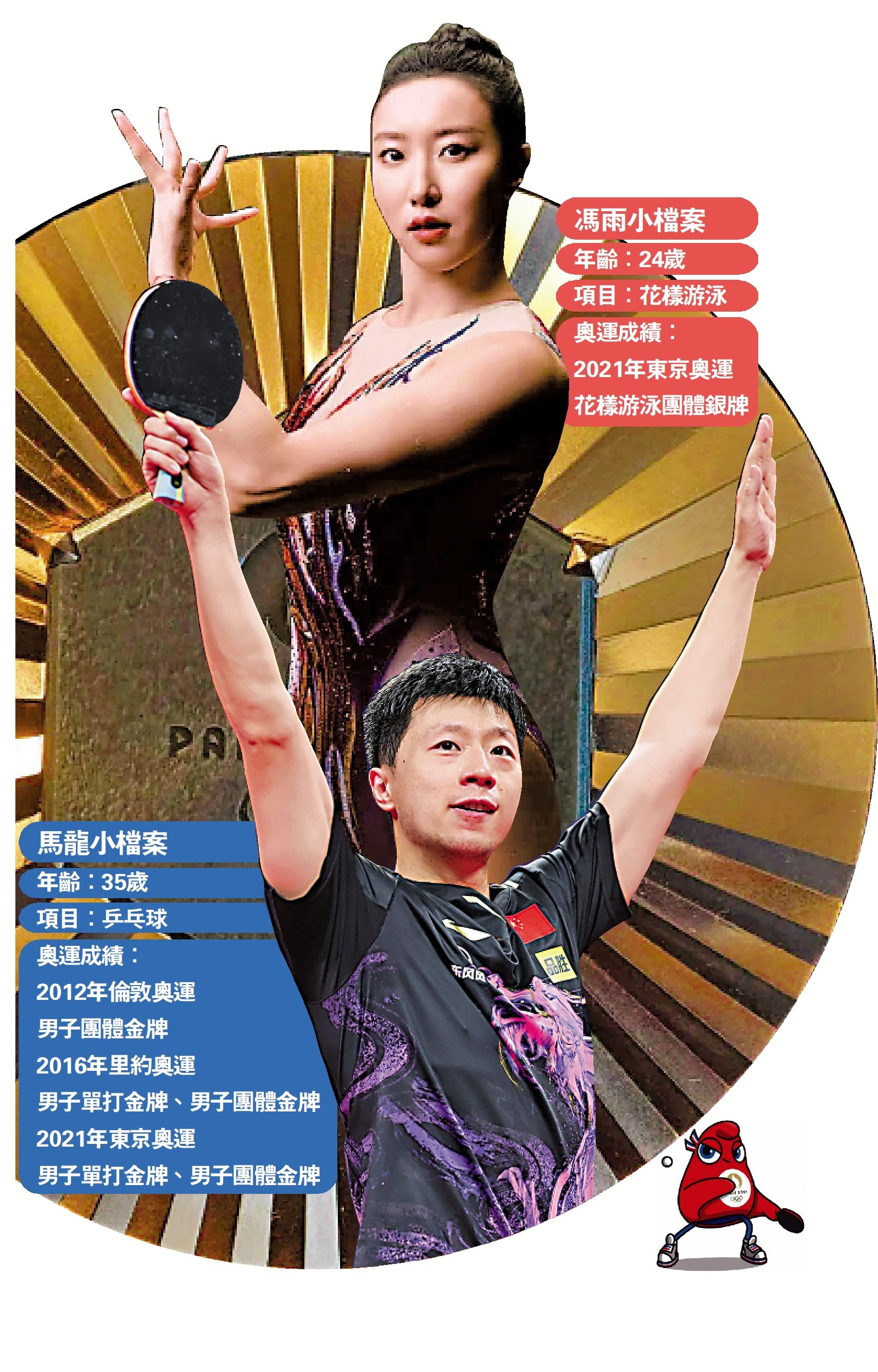 據新華社報道:巴黎奧運會中國體育代表團24日宣布開幕式旗手人選,乒乓球運動員馬龍和花樣游泳運動員馮雨,將擔任巴黎奧運會開幕式中國體育代表團旗手。
