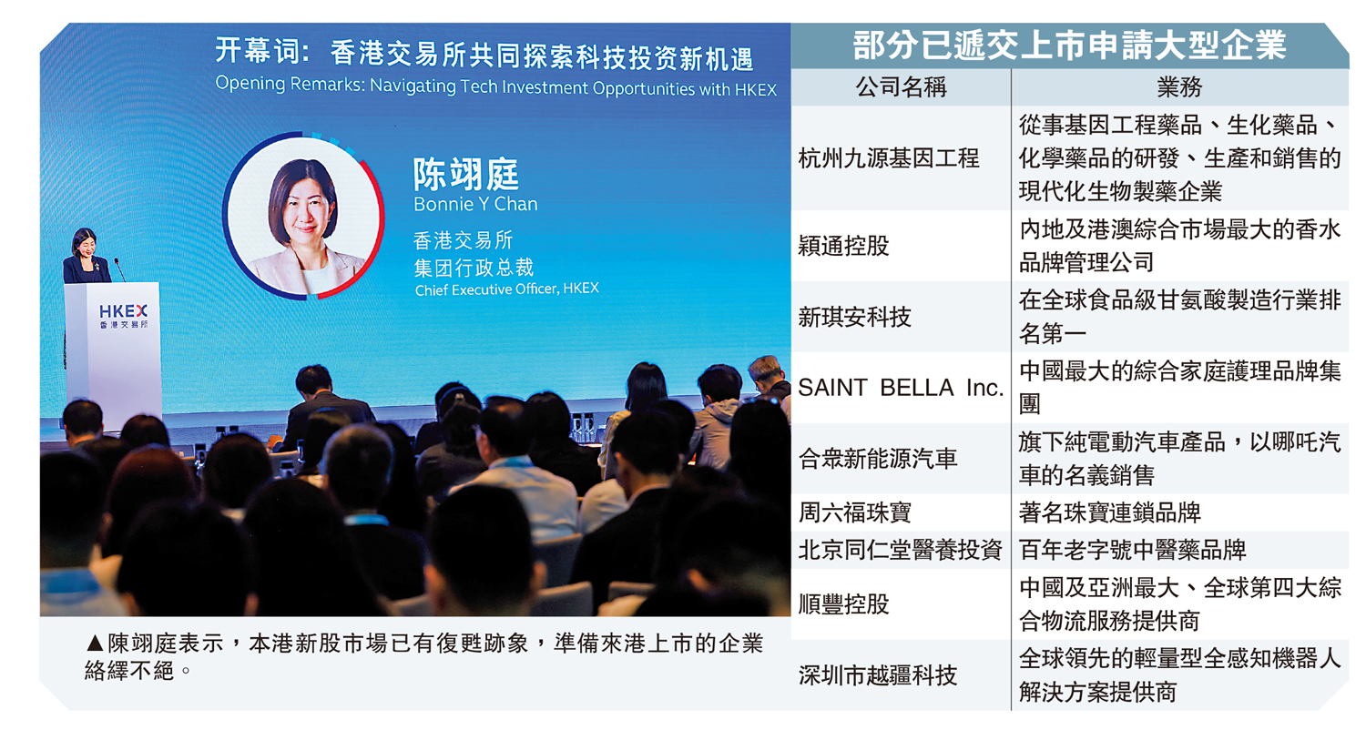 第二屆港交所未來科技峰會昨日在深圳舉行,港交所(00388)行政總裁陳翊庭透露,受惠於市場回暖和不斷改革市場,本港新股市場已有復甦跡象,準備來港上市的企業絡繹不絕,交易所目前正在處理超過百宗上市申請。同時,不少科技公司正在籌備以18C章上市融資。\大公報記者 許臨