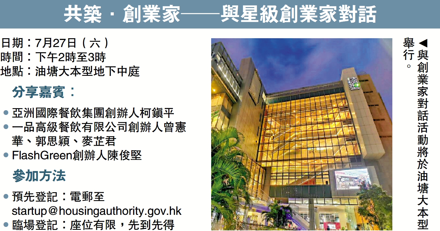 提提大家,活動在「大本型」地下中庭舉行,下午兩點開始,有興趣的市民可以透過以下電郵預先登記,至於臨場登記,則先到先得。電郵登記:startup@housingauthority.gov.hk