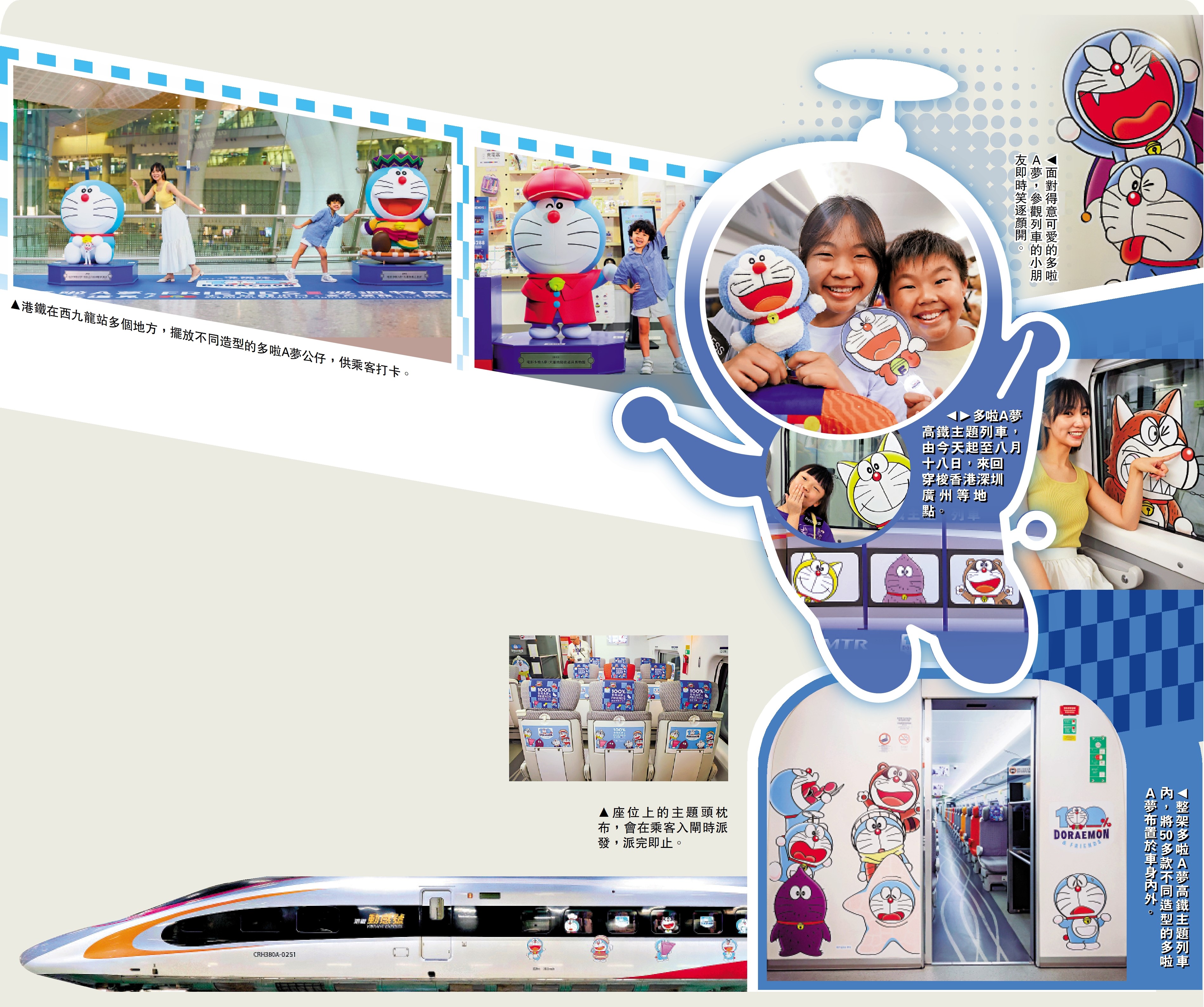 多啦A夢在港持續掀起熱浪,鄭晴近日看過幾次展覽,重溫童年回憶。市民如果想再進一步體驗,除了幻想走進時光機的隧道,還可以走進高鐵隧道。港鐵昨日宣布,繼輕鐵、東鐵綫以及機場快綫後,壓軸推出首列粵港跨境高鐵《100%多啦A夢&FRIENDS》主題列車,由今日至8月18日期間,在指定日子與班次,接載旅客由香港西九龍站往來廣州南、深圳北站及福田站。