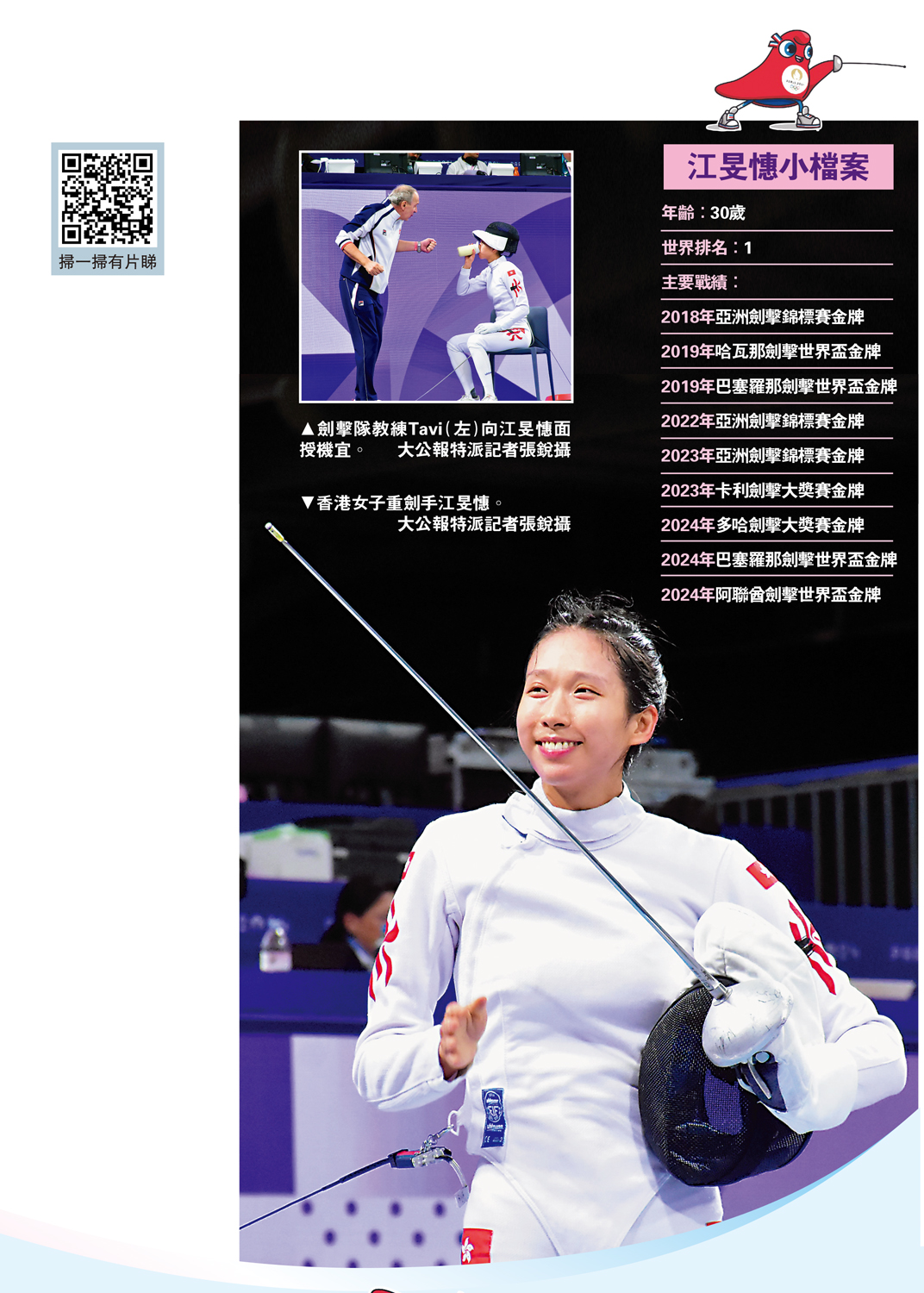 截至香港時間28日凌晨2時,中國香港代表團取得本屆奧運會首枚獎牌。女子重劍選手「微笑劍后」江旻憓昨天出戰女子重劍個人賽,在比賽中更是狀態大勇,一直過關斬將,由32強連戰連勝,於4強賽以15:11淘汰愛沙尼亞劍手妮莉,勇闖今天凌晨3時30分舉行的決賽,坐銀望金,並刷新個人於奧運的最佳戰績。\大公報特派記者 張銳