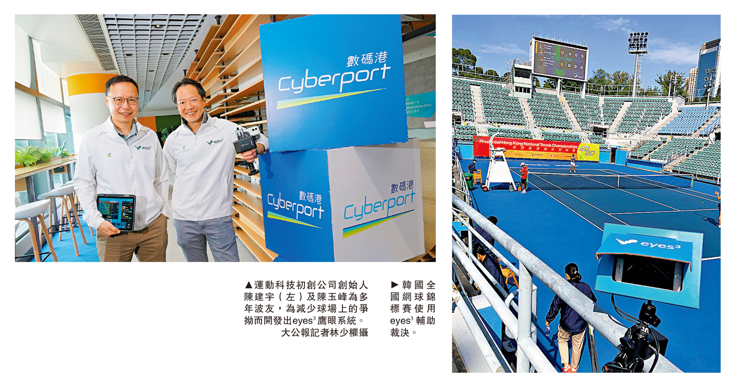 數碼港培育的本港初創企業eyes³研發了一套「平價版」的鷹眼系統,只需在手機上安裝eyes³應用程序,毋須額外組裝或駁線,將手機固定在球場指定位置,幾分鐘內就可以完成布置,提供比真人裁判更精確的自助型裁決。