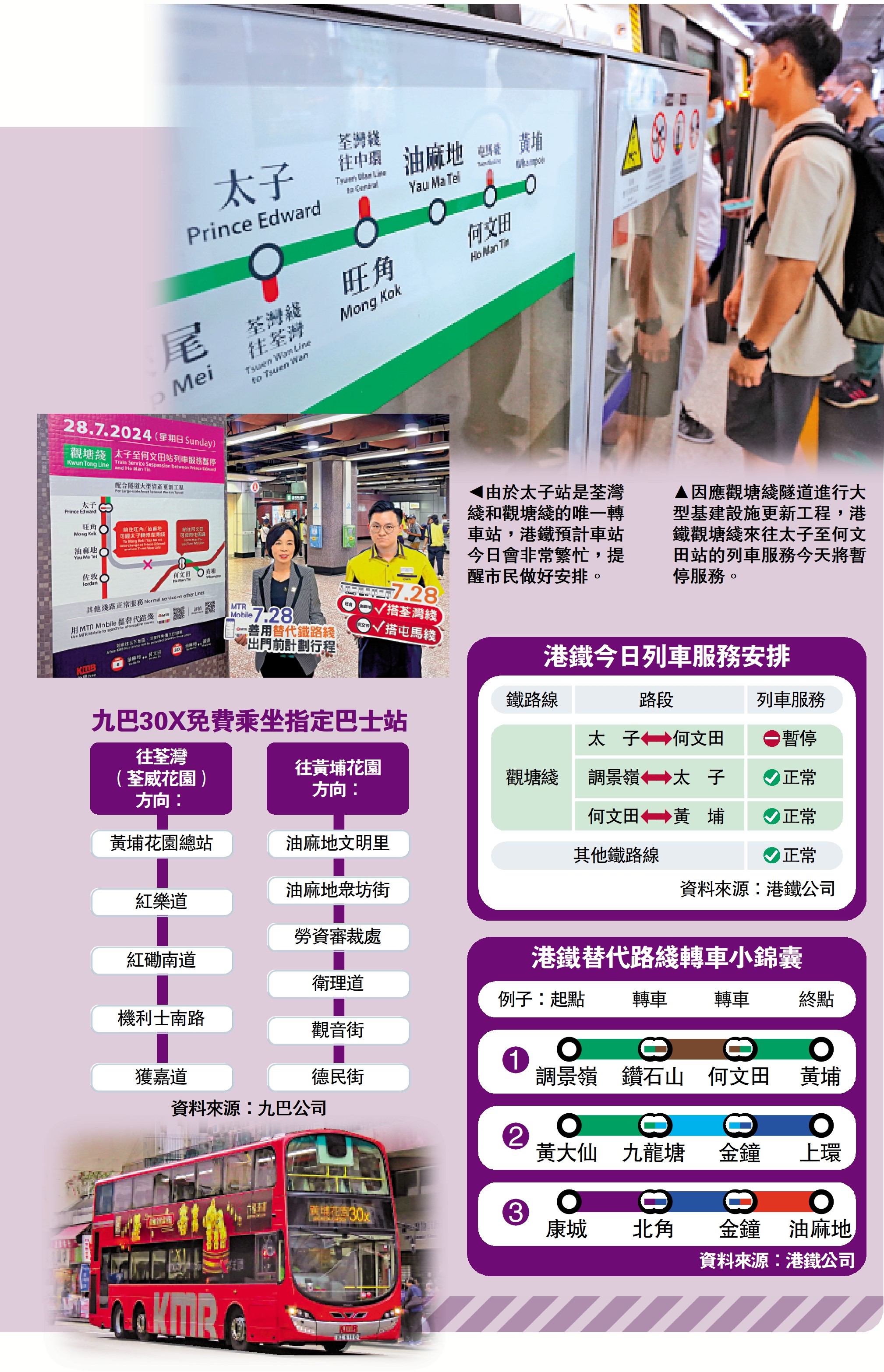 港鐵觀塘綫今日(28日)來往太子至何文田站的列車服務暫停(即該路段包括旺角站及油麻地站不提供服務),以進行鐵路更新工程。