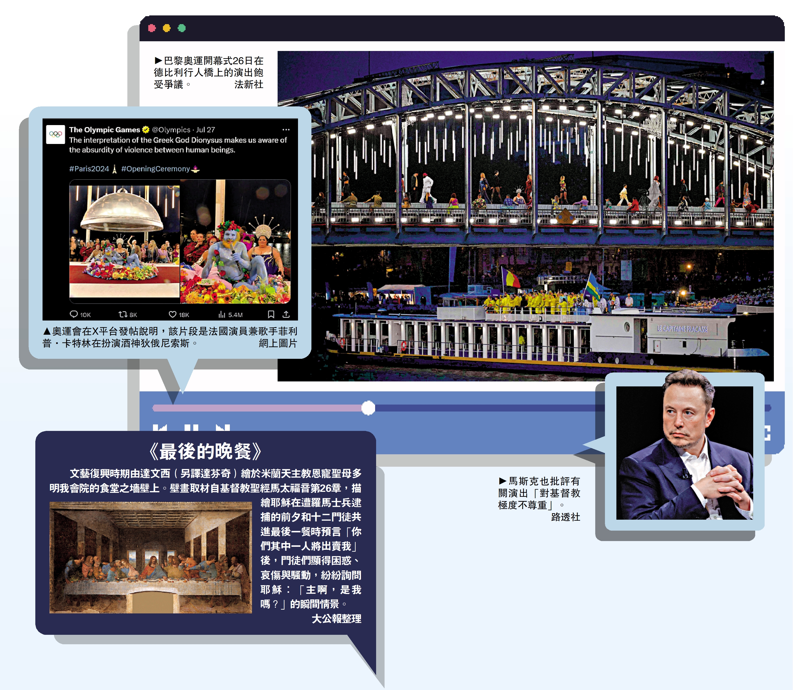 巴黎奧運會開幕式中,一幕由多名變裝皇后、舞者和模特兒演出的場景掀起巨大爭議,被指模仿了畫家達文西(另譯達芬奇)名作《最後的晚餐》,惹來西方保守派和宗教界嚴厲抨擊。巴黎奧組委新聞發言人安妮·德康28日表示,無意對任何宗教團體不敬,「如果有人覺得被冒犯,我們真的很抱歉」。而國際奧委會發言人則表示,本屆奧運會開幕式好評率達88%。