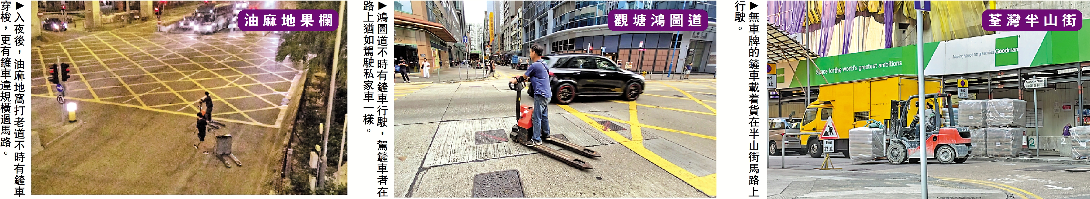 同樣情況在觀塘工業區亦經常發生,日前下午2時至5時,記者看到鴻圖道上有多輛電動鏟車在馬路上穿梭,車上並無載有貨物,而工人站在車上駕駛,有如駕駛自己的座駕,在馬路及行人路上,並在車龍及繁忙的十字路口左穿右插。
