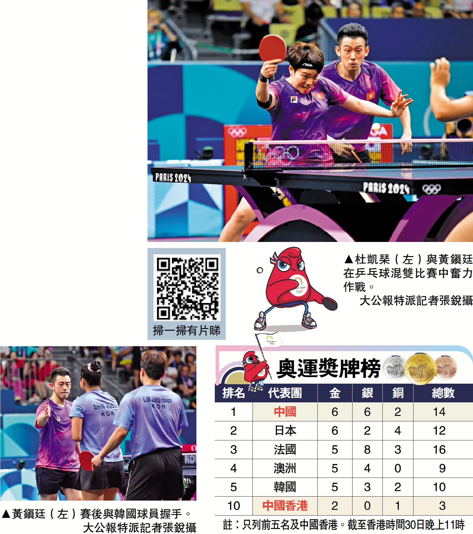 【大公報訊】特派記者張銳巴黎報道:「黃杜配」黃鎮廷/杜凱琹失獎仍獲香港最佳成績,這對世界排名第4的中國香港乒乓球混雙組合,周二出戰巴黎奧運乒乓球混雙銅牌戰,面對世界排名高一位的韓國組合林鐘勛/申裕斌,「黃杜配」力戰下仍以局數0:4見負,與獎牌擦身而過,不過第4名仍締造香港在奧運乒乓球混雙項目的最佳戰績。