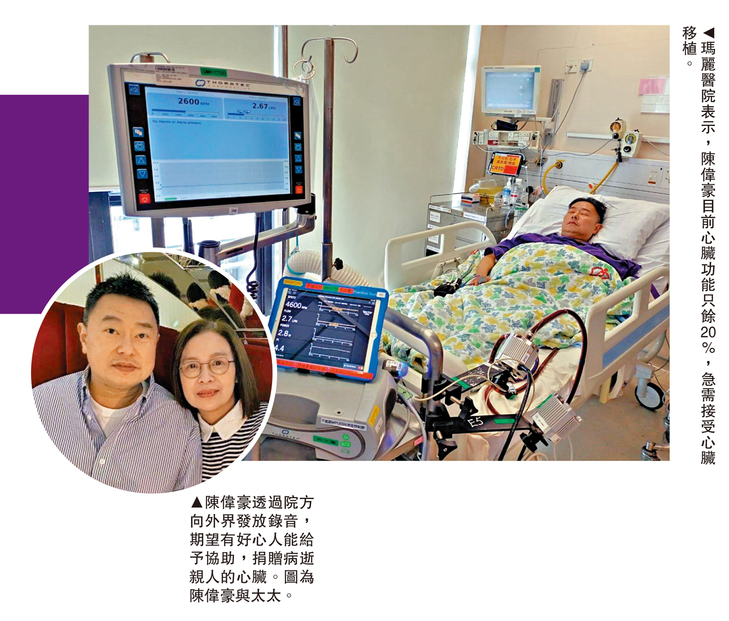 「我自己躺在床上,什麼都做不到,他們(家人)都很痛苦,我知道。」陳偉豪昨日透過院方發放錄音表示,10歲得知心臟問題,30歲曾在街上暈倒,需送院治理,發現心律不正,2017至2018年確診心臟衰竭。他說去年身體每況愈下,醫生向其母親指他「隨時會死」,母親十分傷心。他感激仍需上班的太太,每日來回照顧他;孫仔每天在電話內向他說「爺爺加油」。他哽咽說,過去經常與家人一同吃飯,「好似輕而易舉的事,現在看上來都不能做下去。」他期望有好心人協助,讓他可像普通人出行生活,「我真的希望有好心人可以幫到我,就算結果如何,都是命運。」
