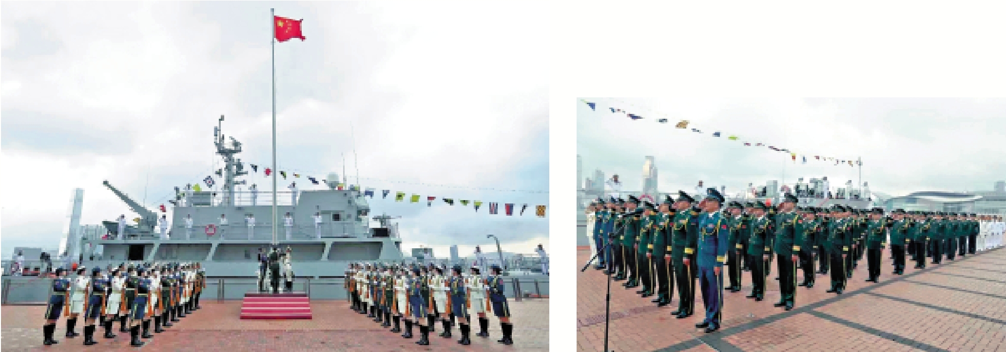 清晨,中區軍用碼頭駐香港部隊海軍艦艇抵岸靜泊、滿旗高懸,陸海空三軍官兵代表軍姿颯爽、整齊列隊。來隊探親的家屬們莊嚴肅立,與官兵一同迎接國旗的到來。