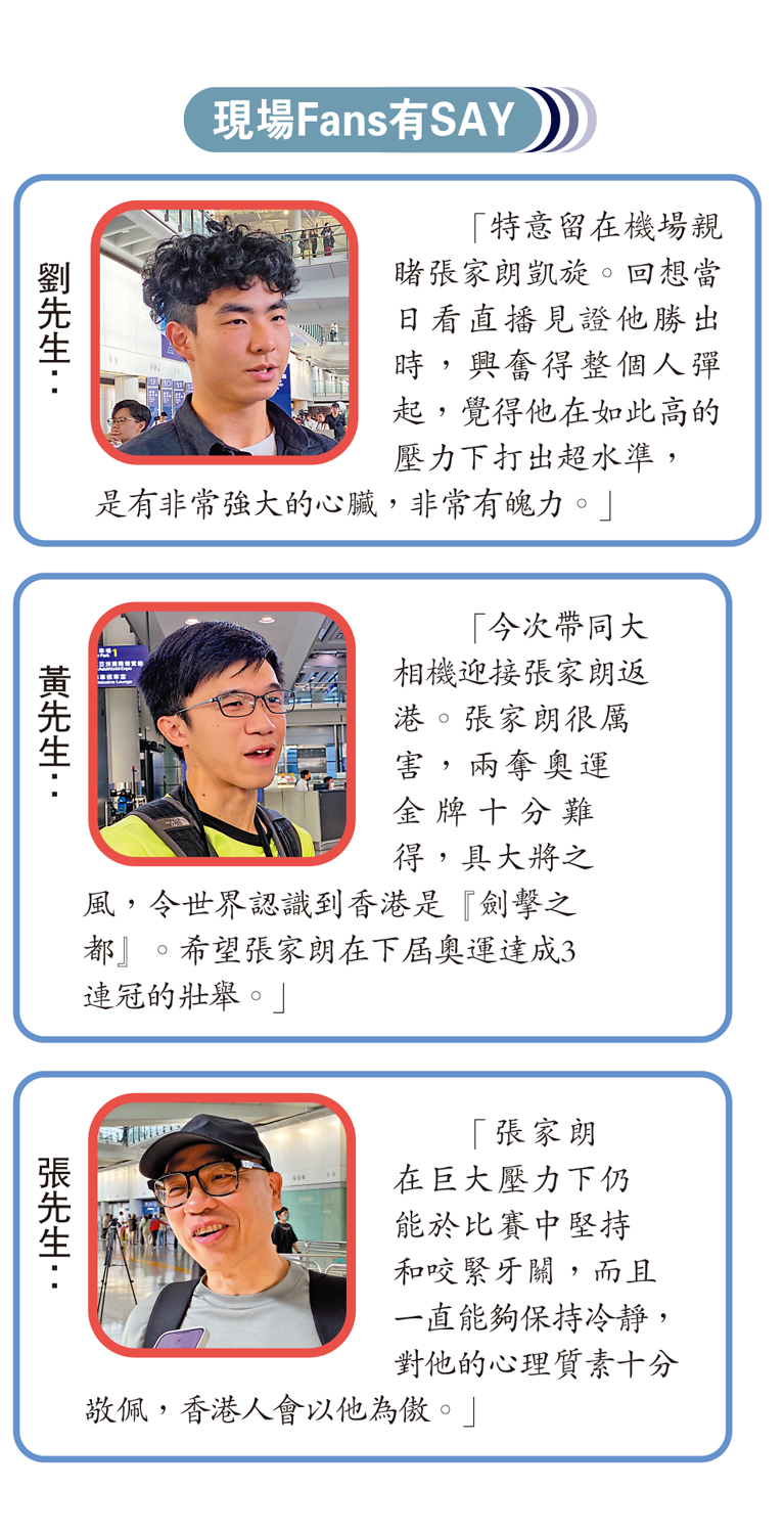 「特意留在機場親睹張家朗凱旋。回想當日看直播見證他勝出時,興奮得整個人彈起,覺得他在如此高的壓力下打出超水準,是有非常強大的心臟,非常有魄力。」