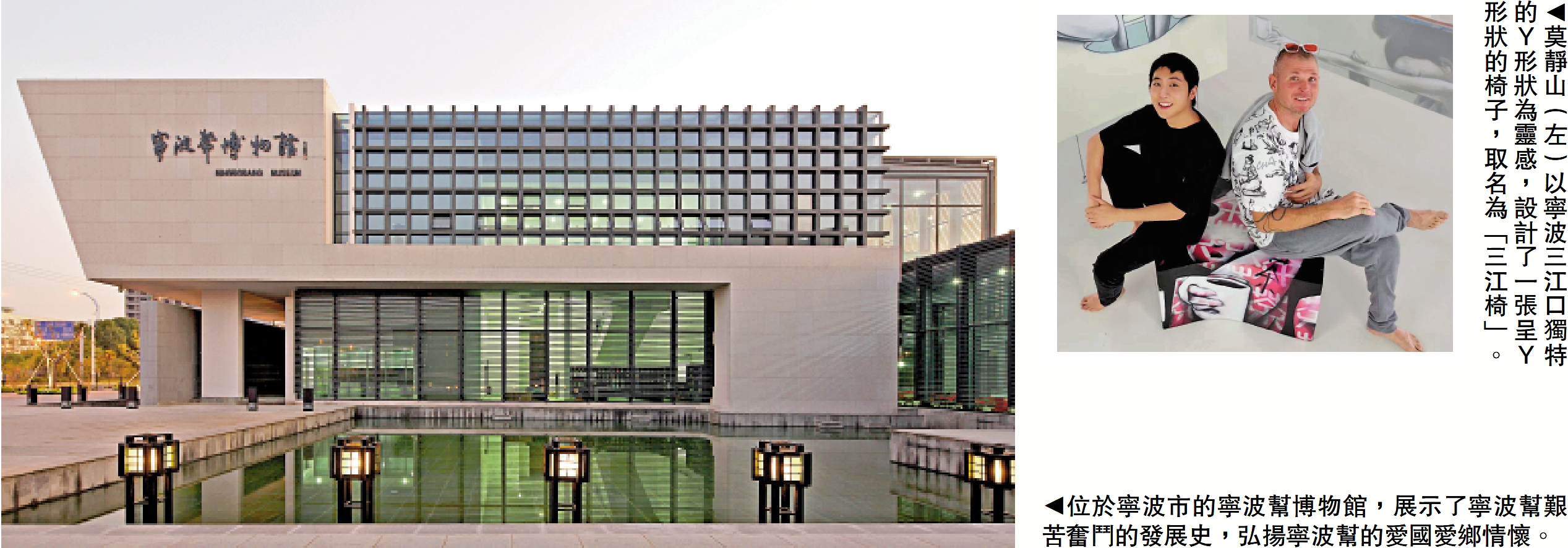 以寧波三江口獨特的Y形狀為靈感,香港設計師莫靜山設計出了一張呈Y形狀的椅子,取名為「三江椅」。