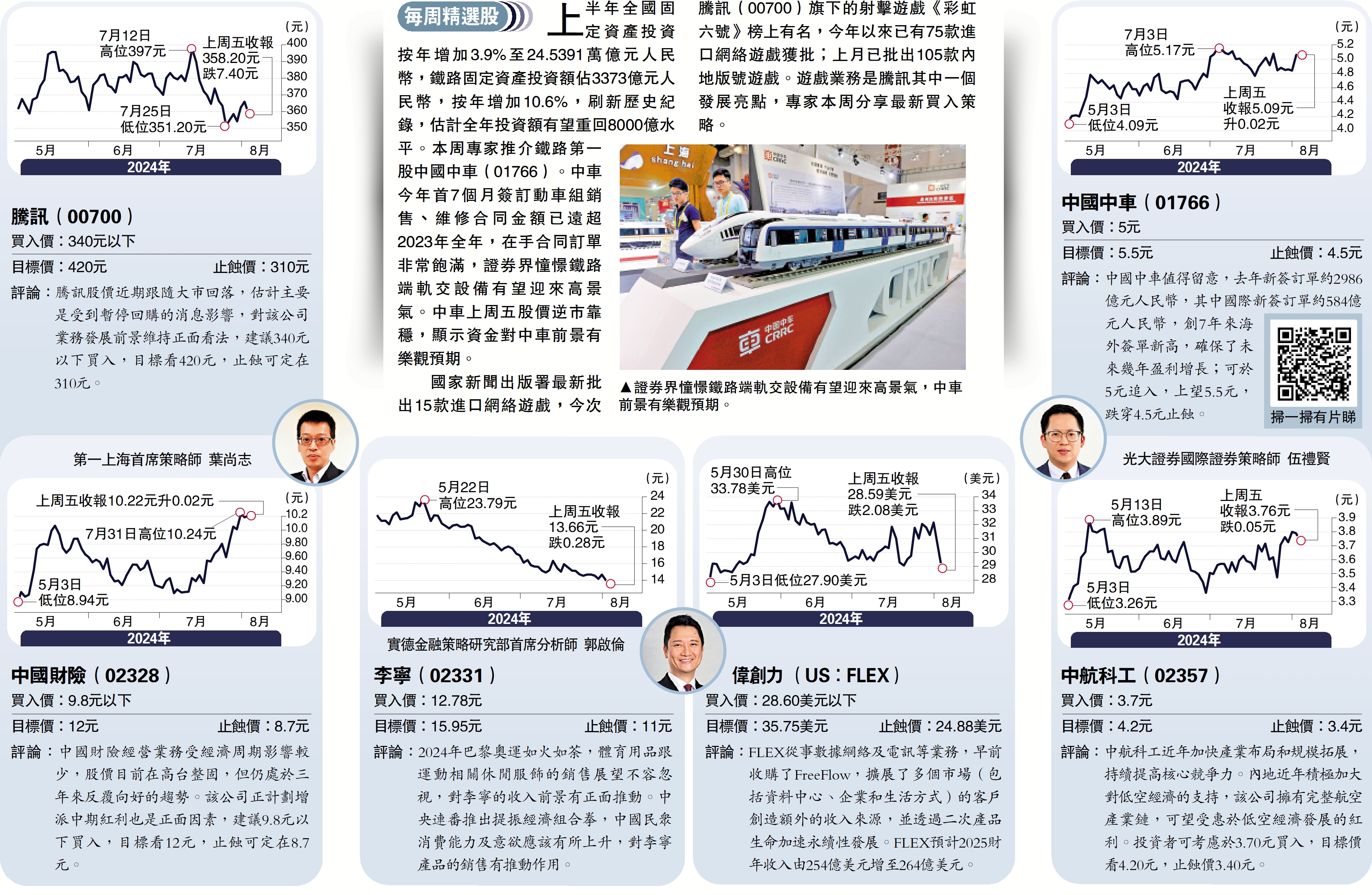 上半年全國固定資產投資按年增加3.9%至24.5391萬億元人民幣,鐵路固定資產投資額佔3373億元人民幣,按年增加10.6%,刷新歷史紀錄,估計全年投資額有望重回8000億水平。本周專家推介鐵路第一股中國中車(01766)。中車今年首7個月簽訂動車組銷售、維修合同金額已遠超2023年全年,在手合同訂單非常飽滿,證券界憧憬鐵路端軌交設備有望迎來高景氣。中車上周五股價逆市靠穩,顯示資金對中車前景有樂觀預期。