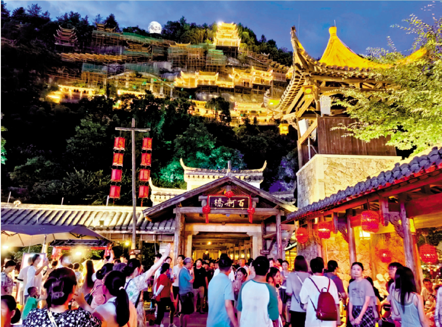 值得一提的是,新建的房子遮住了以前開採山體所造成的痕跡,呈現在眼前的是懸崖上的小鎮。鱗次櫛比的黃牆灰瓦夯土房,街道上錯落有致的青石板,臨街舖面帶着歲月痕跡的木門,最搶眼的是高聳馬頭牆,留住了傳統村落的神韻。望仙谷具有濃郁的贛家鄉村文化,包括江西特有的建築、環境、農業種植、飲食、古法的手藝、手作。比如,引進紅糖、榨油、釀酒、年糕、豆腐、葛粉作坊,上百種特色小吃,可讓遊客回味當地人童年時的味道。同時,緊盯新時代年輕人消費理念,將遊戲經典地圖「十方鎮」植入景區,推出「仙俠盛典」、「盛月遊俠」、「跨年盛典」等主題活動。