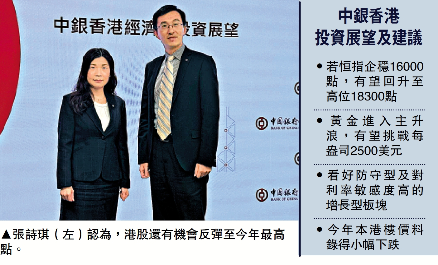 面對市場波動,中銀香港財富策略及分析處主管張詩琪認為,美債孳息率拐點已經出現,黃金進入主升浪,有望挑戰每盎司2500美元。她建議,投資者應以股票、債券及黃金多元資產配置,提升風險調節後的回報。另外,若果恒指能企穩在16000點,有望在市場氣氛好轉時回升至高位18300點左右,看好防守型及對利率敏感度高的增長型板塊。