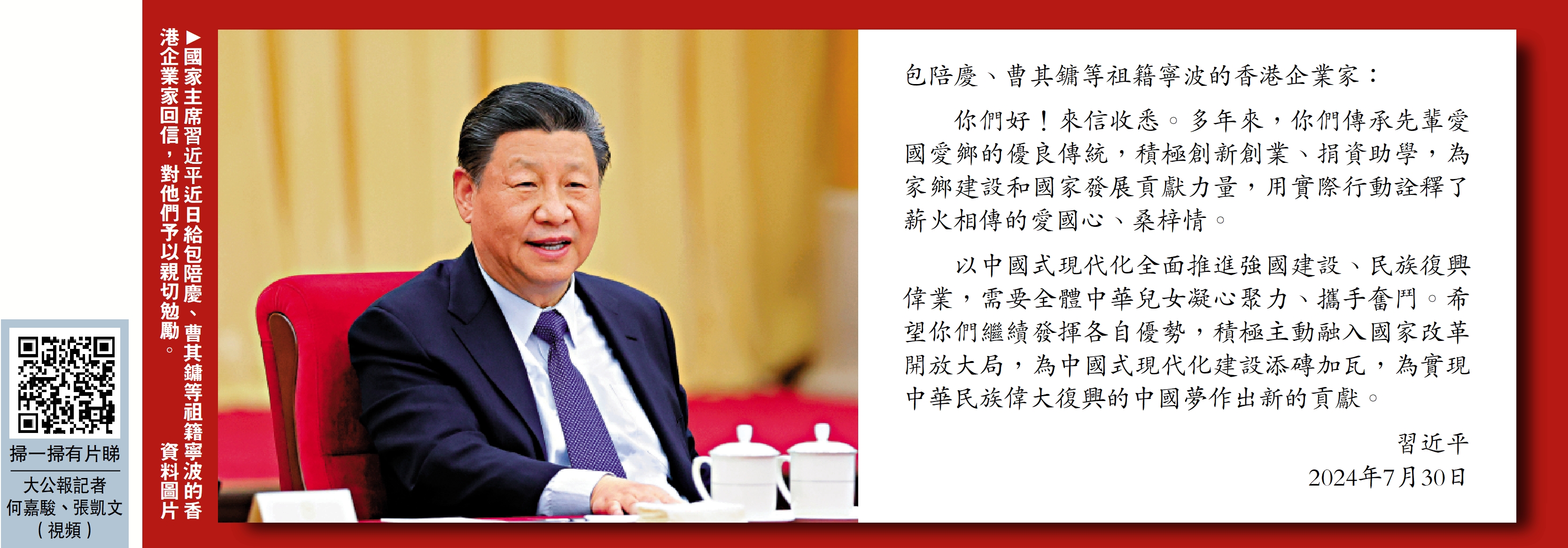 香港工商界學習貫徹習近平主席給祖籍寧波的香港企業家重要回信精神座談會昨日在港舉辦。會議首先宣讀了習主席給祖籍寧波的香港企業家的重要回信,習主席在回信中,高度評價他們傳承先輩愛國愛鄉的優良傳統,充分肯定他們為家鄉建設和國家發展所作貢獻,殷切勉勵他們繼續為以中國式現代化全面推進強國建設、民族復興偉業貢獻力量。