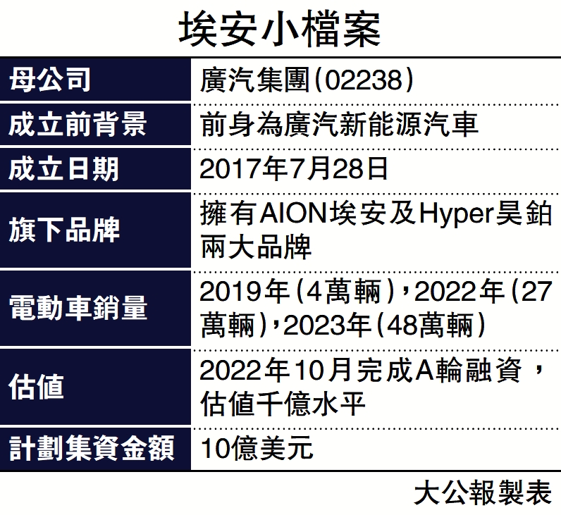【大公報訊】廣汽集團(02238)旗下新能源車品牌埃安籌備在港上市。埃安估值達千億水平,市傳最快今年分拆上市,擬集資10億美元(約78億港元),由中金公司和華泰證券擔任承銷商。目前各項上市準備工作正在如期開展中。
