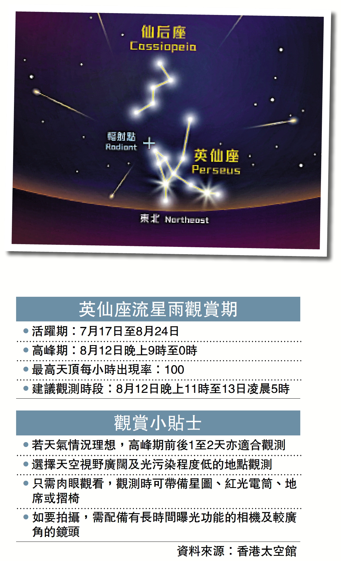 今年英仙座流星雨的活躍期為7月17日至8月24日,高峰期在8月12日,預計流星雨輻射點會在晚上約10時從東北方升起,隨着輻射點位置升高,流星的數量亦會隨之增加。高峰期當晚為農曆初九,月球將於約11時半下山,建議於晚上11時至翌日凌晨5時觀測,天頂每小時出現率可達100,本地觀測條件評級為「良好」。
