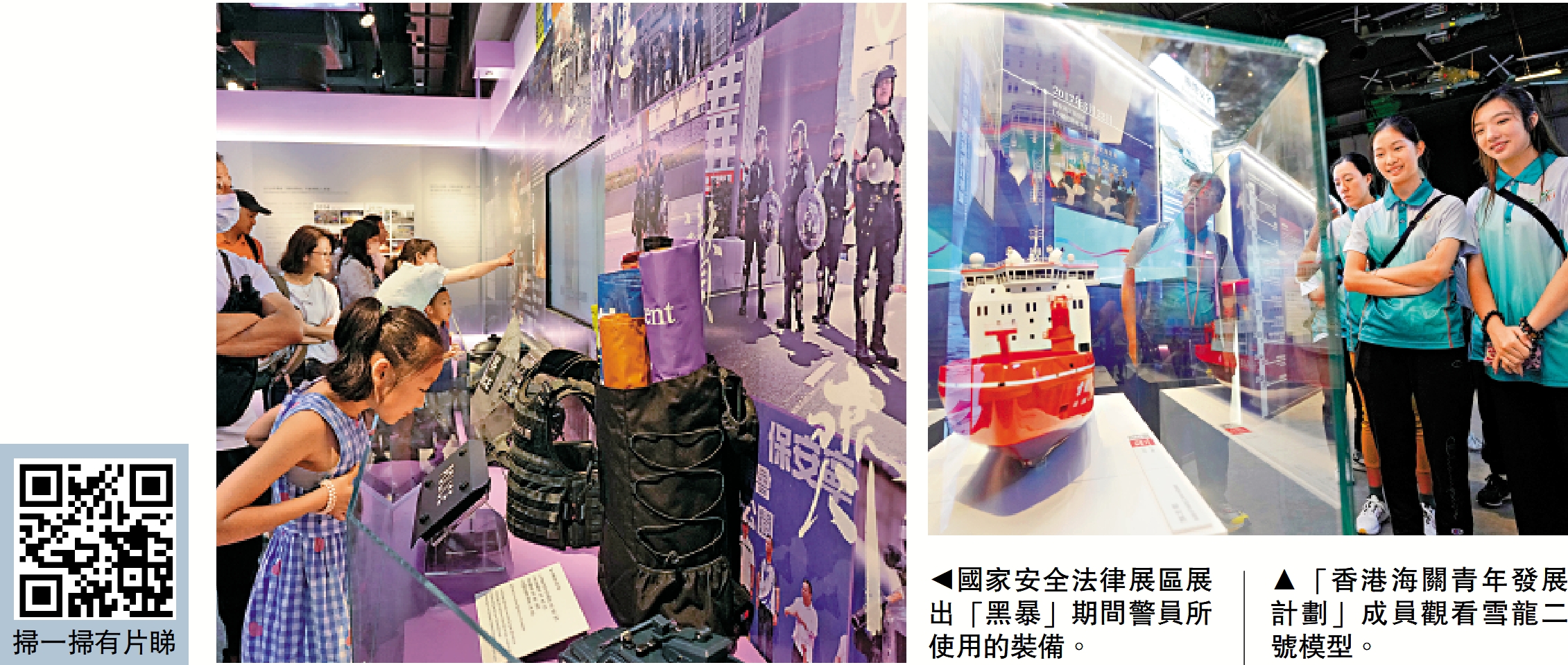 設於香港歷史博物館的「香港特別行政區國家安全展覽廳」昨日起向公眾免費開放。昨早10時前,展廳外已經有市民排隊等候進入。當日全天展廳內人流絡繹不絕。月球土壤、雪龍二號模型,以及「黑暴」期間警方使用的裝備、旗幟等展品,都吸引了不少市民和遊客駐足觀看。