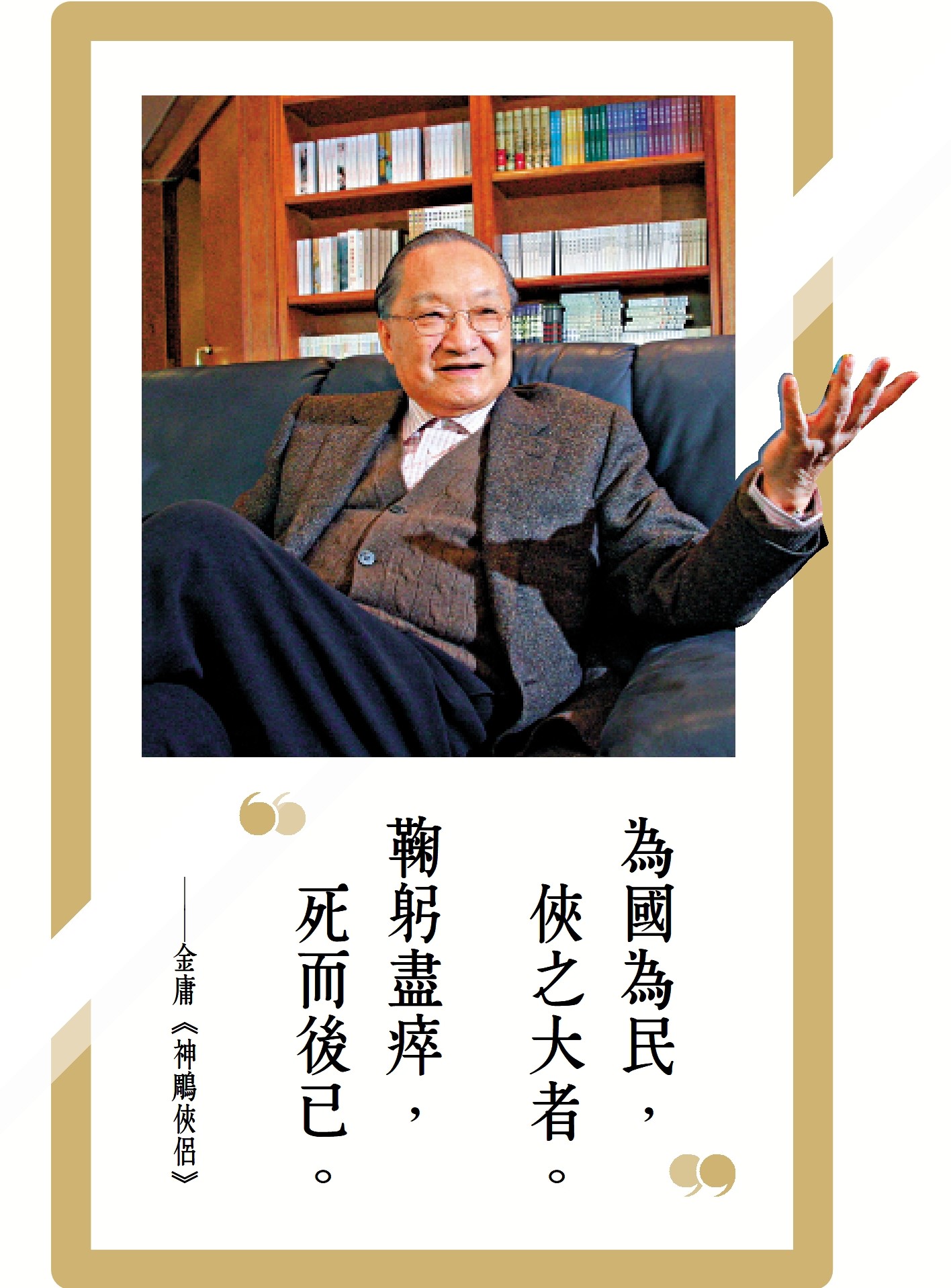 習近平主席近年一再強調,中華優秀傳統文化是中華民族的文化根脈。文化是一個國家、一個民族的靈魂。他特別指出,評價一個制度、一種力量是進步還是反動,重要的一點是看它對待歷史、文化的態度。金庸先生是我國新派武俠小說的傑出代表,他同古龍、梁羽生和溫瑞安等作家一起,共同推動了中國新派武俠小說的發展。金庸的新派武俠小說是新文化運動之後的又一場文學革命。他的作品早已跨越雅俗之界,具有守正創新的時代特徵。其故事情節更加曲折,歷史背景更加深遠,場景描寫更加奇巧,人物刻畫更加生動,家國情懷更加鮮明,知識含量更加豐富。他的作品不僅深受中國兩岸四地不分男女老幼不同政治傾向讀者的喜愛追捧,而且也在世界各地華人華僑以及外國讀者中廣泛傳播。據不完全統計,金庸先生的作品截至他去世那一年就已出版發行了三億多冊,根據他作品拍的影視劇超過一百部。因為今年是金庸先生誕辰一百周年,去年以來其作品又掀起熱銷,銷量比往年激增百分之五十五。這個銷量在近現代應該沒有哪一個作家能夠超越。縱觀整個二十世紀中國文壇,金庸武俠小說無疑樹起了一座標桿──以雅俗共賞的人物、故事、場景等,直接、頻繁而又廣泛地進入大眾生活。名動天下的金大俠影響了華人世界幾代人的價值觀念和人生理想。可以說,金庸不僅屬於香港、屬於華語文化圈,更屬於全世界熱愛中國文學、喜歡中華文化的所有讀者。金庸先生是真正的愛國者,他不僅是香港、也是我們國家乃至全球炎黃子孫中的傑出報人、優秀作家和具有廣泛影響力的文壇大師。