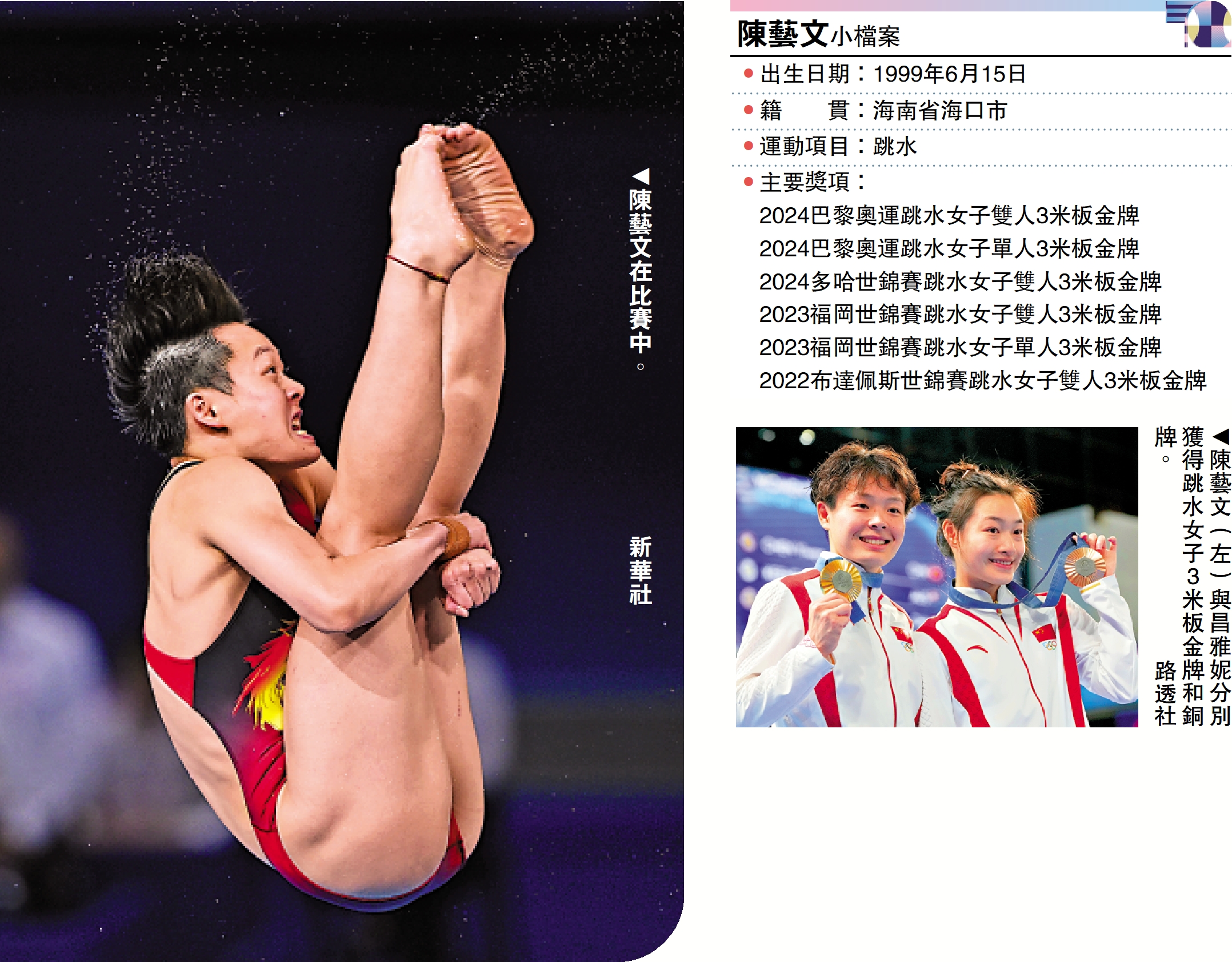 巴黎奧運跳水女子3米板決賽昨晚上演,中國選手陳藝文及昌雅妮在完成雙人賽奪金任務後,轉戰個人賽決個高下,競逐金牌。儘管昌雅妮首跳意外失手,最終僅獲銅牌,但陳藝文發揮穩定,自首跳佔據首位後一直領先,由頭帶到尾下取得總分376分,以無敵姿態為中國隊取得今屆跳水項目第7面金牌,亦保持挑戰一屆奧運盡攬8金的機會。\大公報記者 梁潤森
