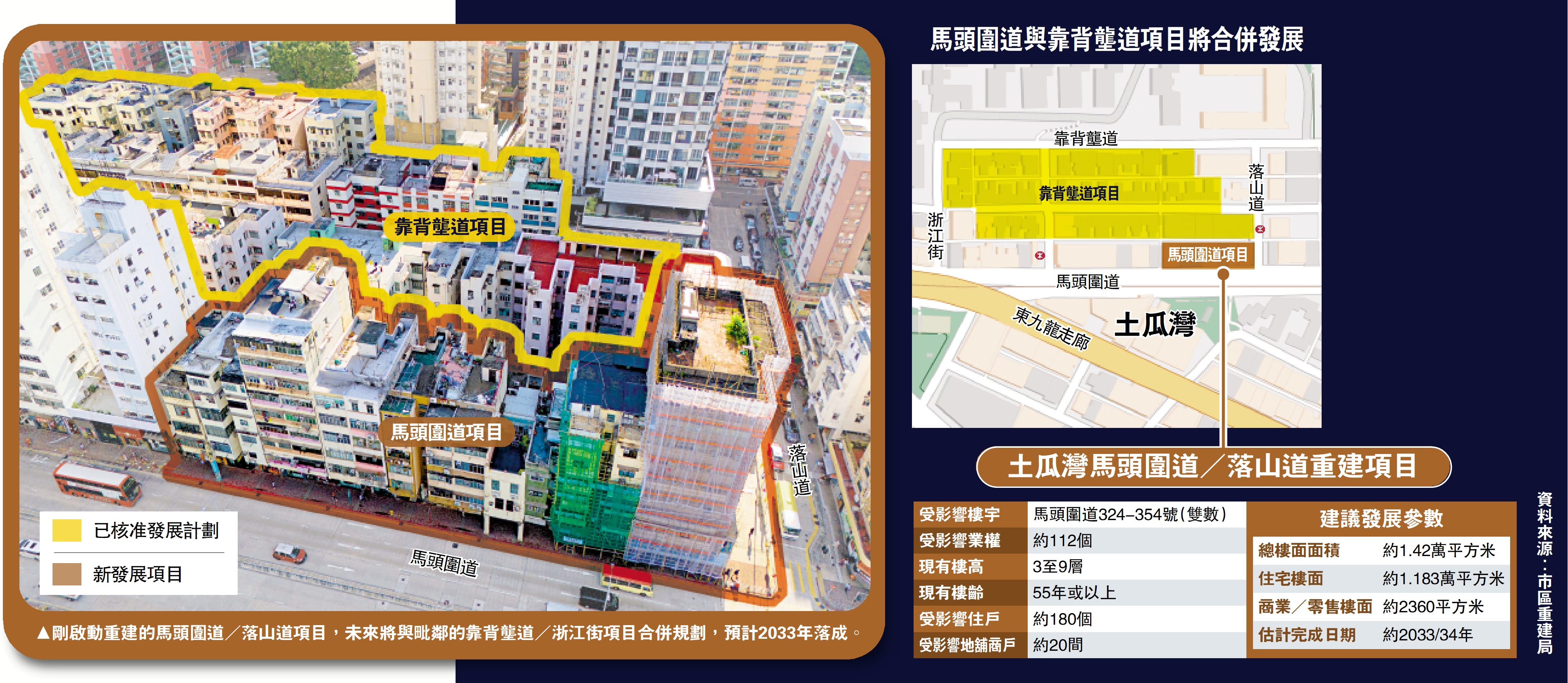市區重建局昨日宣布啟動土瓜灣馬頭圍道/落山道重建項目,涉及15個街號樓宇合共180個住戶、20間地舖受影響,項目未來將與毗鄰的靠背壟道/浙江街項目合併規劃,預計2033年落成。市建局形容,今次需收購業權只有約112個,屬於輕資本項目,預計收購成本約10多億元。