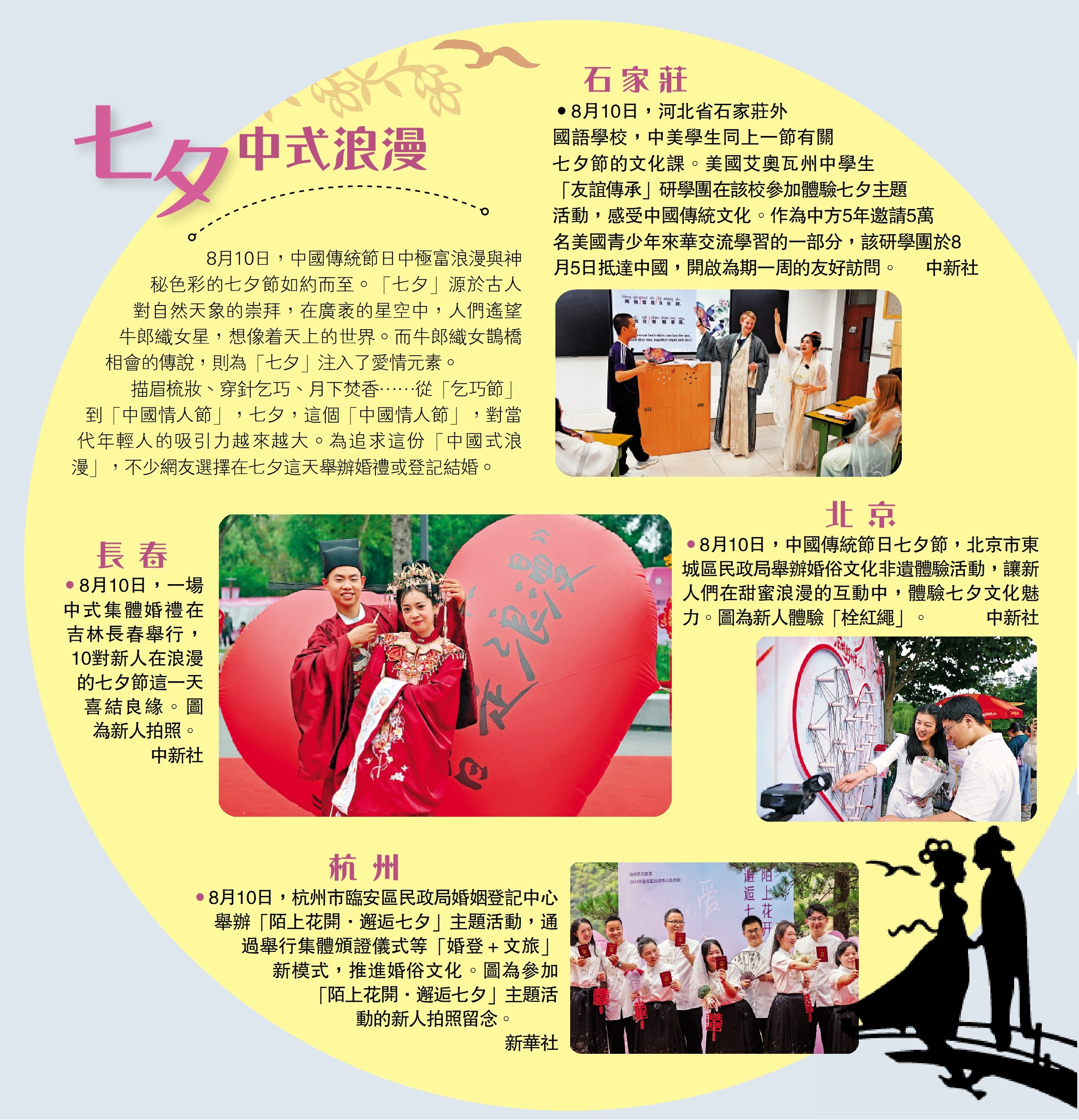 •8月10日,河北省石家莊外國語學校,中美學生同上一節有關七夕節的文化課。美國艾奧瓦州中學生「友誼傳承」研學團在該校參加體驗七夕主題活動,感受中國傳統文化。作為中方5年邀請5萬名美國青少年來華交流學習的一部分,該研學團於8月5日抵達中國,開啟為期一周的友好訪問。\中新社