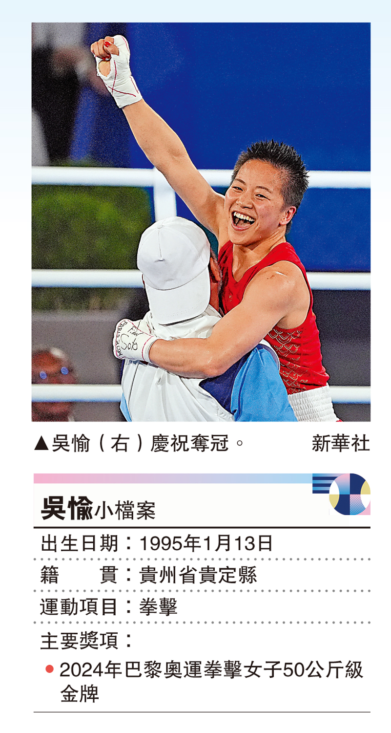 這是29歲的吳愉第一次參加奧運,此前她曾在2019年世界軍人運動會、2023年世界女子拳擊錦標賽、2023年杭州亞運會等賽事中奪冠。「我今天拿下(金牌),沒有掉一滴眼淚,甚至沒有很驚喜,因為內心我覺得我做到了,我戰勝了自己,這塊金牌真的是我應該拿的。」吳愉說。